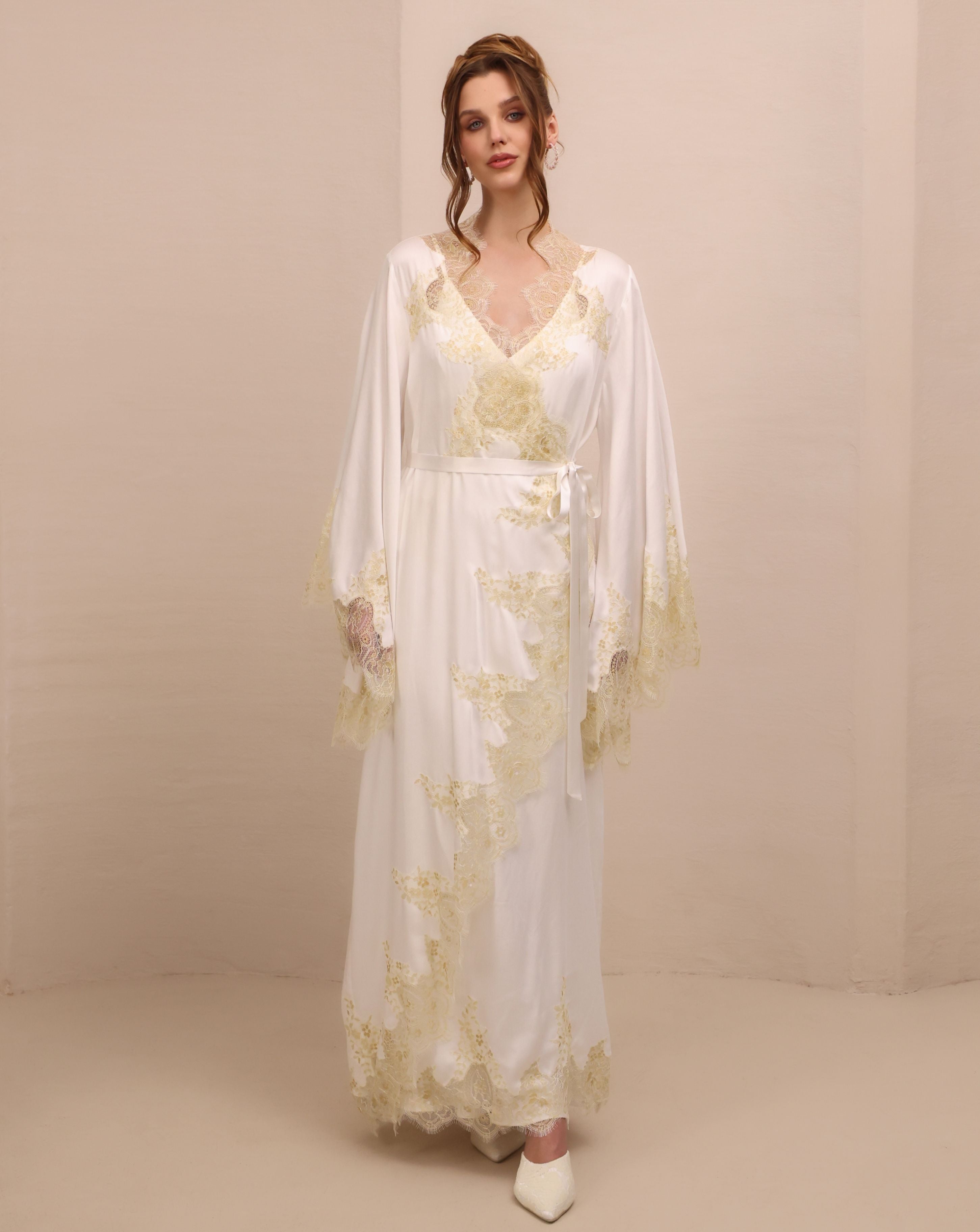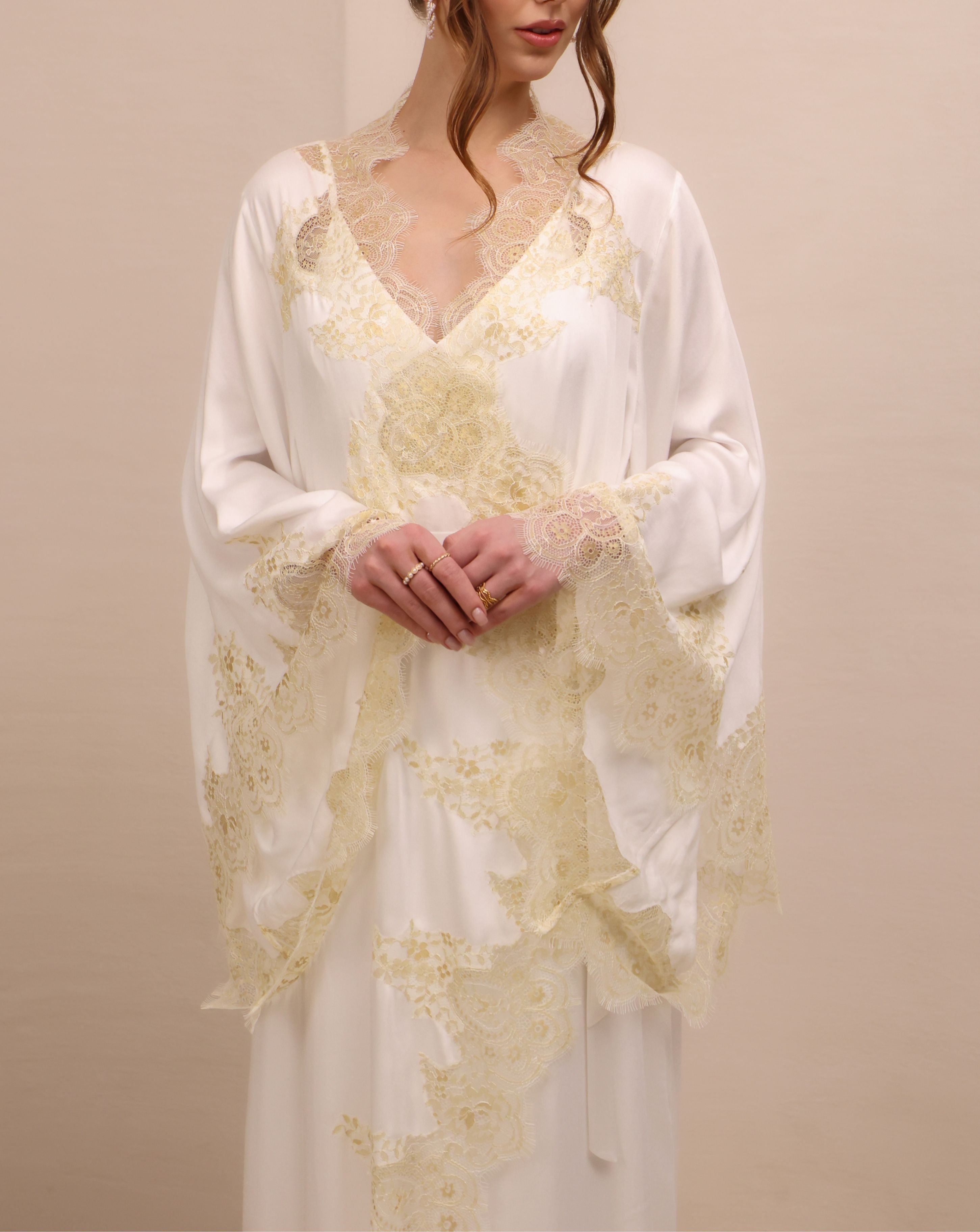 Crafted from soft, breathable rayon, the Abu Dhabi robe falls effortlessly over the body, creating movement with every step. Delicate lace is placed with intention, tracing the neckline, sleeves, and hem in a way that feels both refined and unmistakably feminine. The wide sleeves add presence, while the adjustable tie cinches the waist with ease.