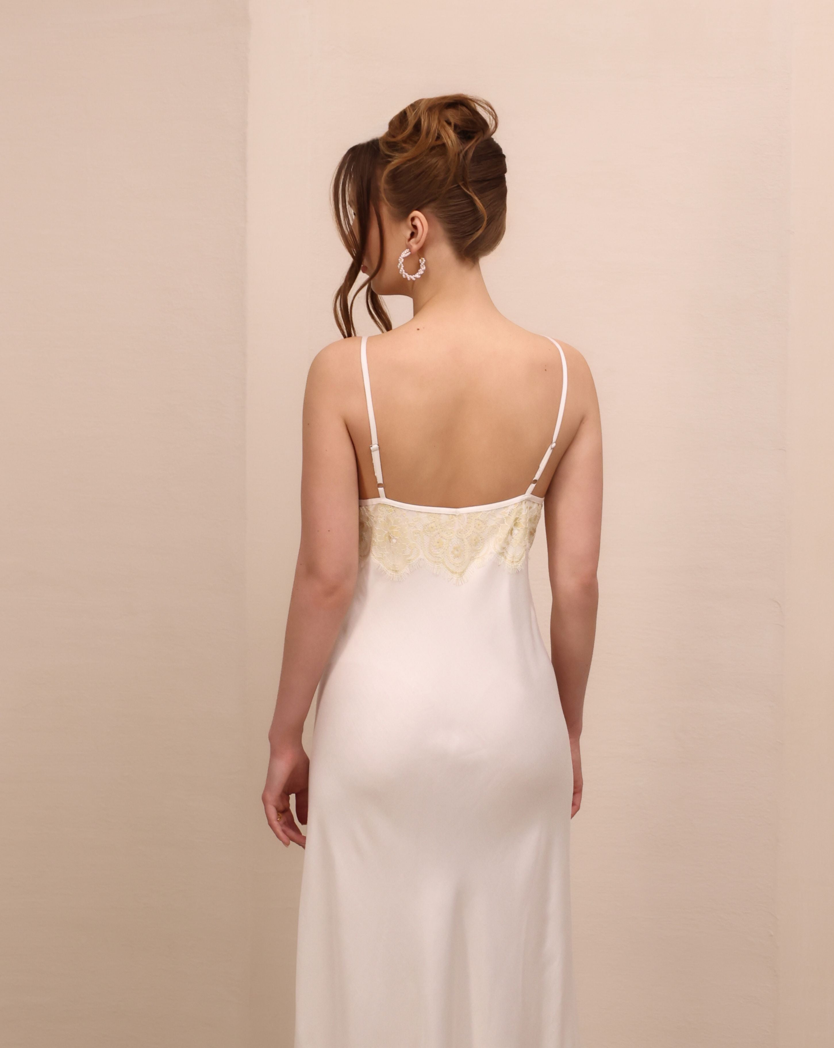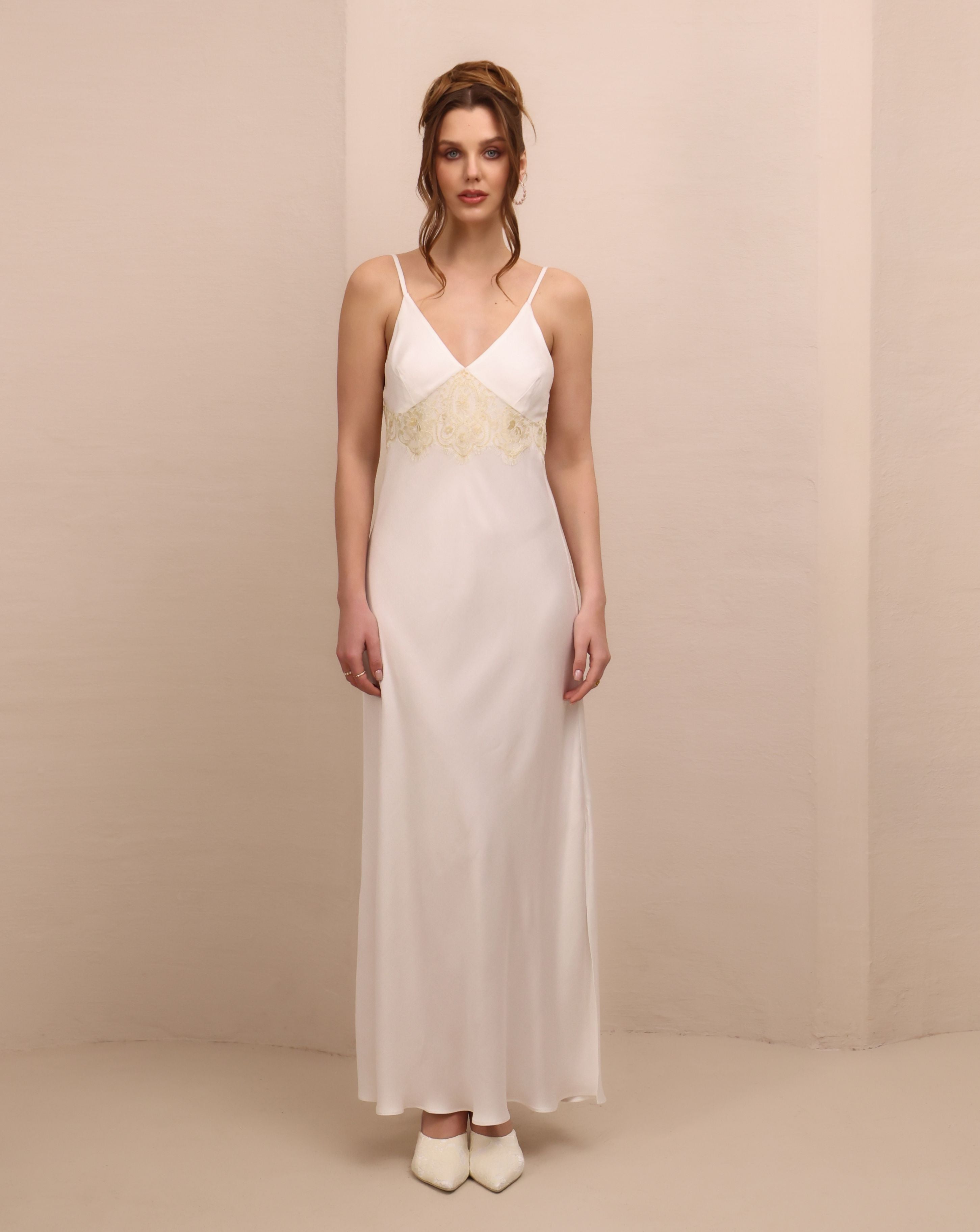 Beneath, a minimal slip dress offers a smooth, understated base. Designed to complement rather than compete, it follows the body softly, with a clean silhouette and a subtle slit for movement. Worn together, the balance is effortless.