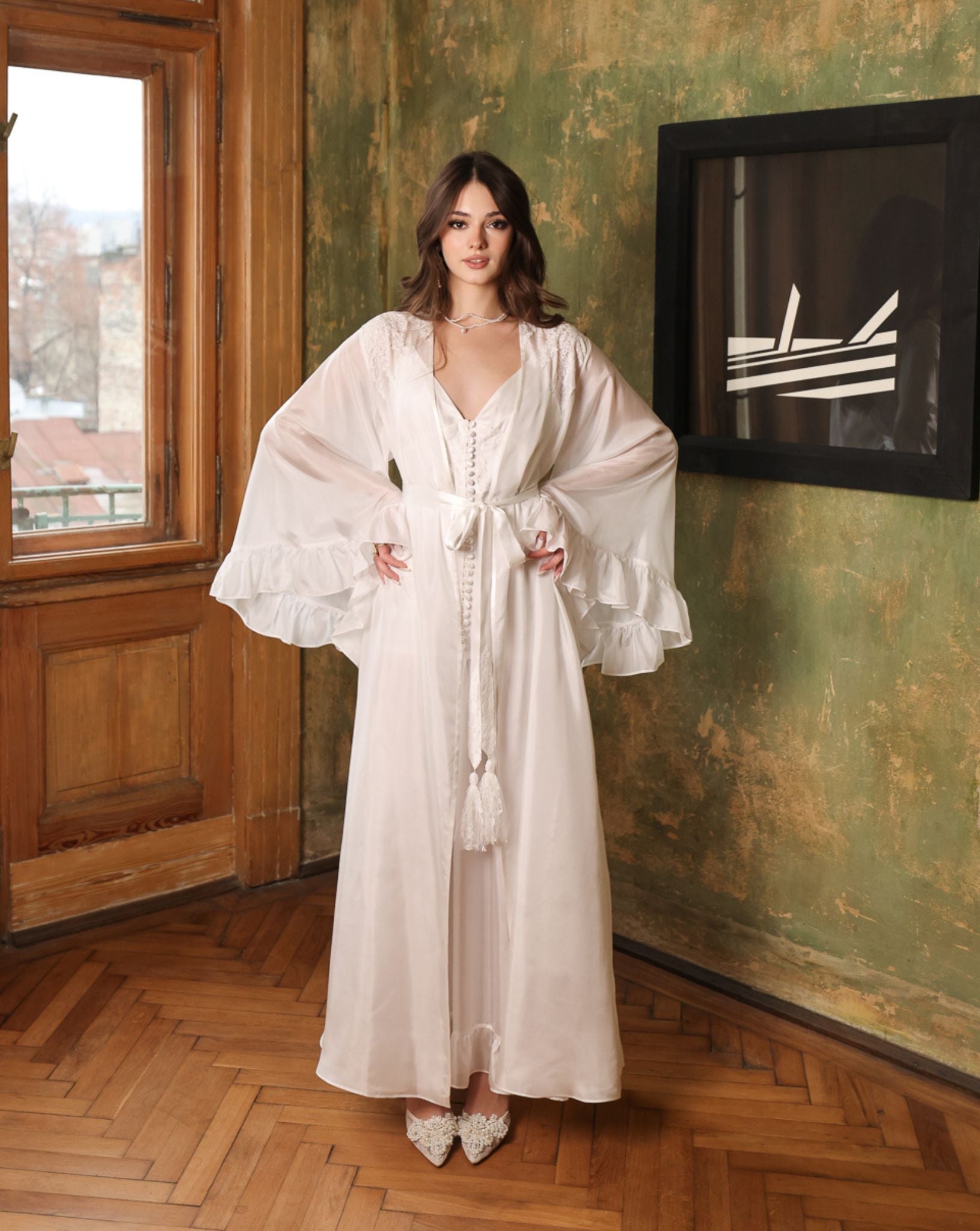 Step into timeless elegance with this exquisite robe and nightgown set, crafted from pure silk for a truly luxurious feel. The flowing robe, made from 100% silk habotai, drapes effortlessly with its soft, airy texture and romantic ruffle detailing. Its wide sleeves and delicate lace accents create a graceful silhouette, while the silk tie belt cinches the waist with ease. Underneath, the 100% silk satin nightgown glides over the body, featuring a flattering slit and a row of handcrafted silk buttons that add couture-level charm. The silhouette is enhanced with subtle gathers and lace embellishments, blending softness and sensuality in perfect harmony. Ideal for bridal moments, self-gifting, or quiet luxury evenings, this set is a poetic expression of femininity—light, silky, and made to be cherished for years to come.