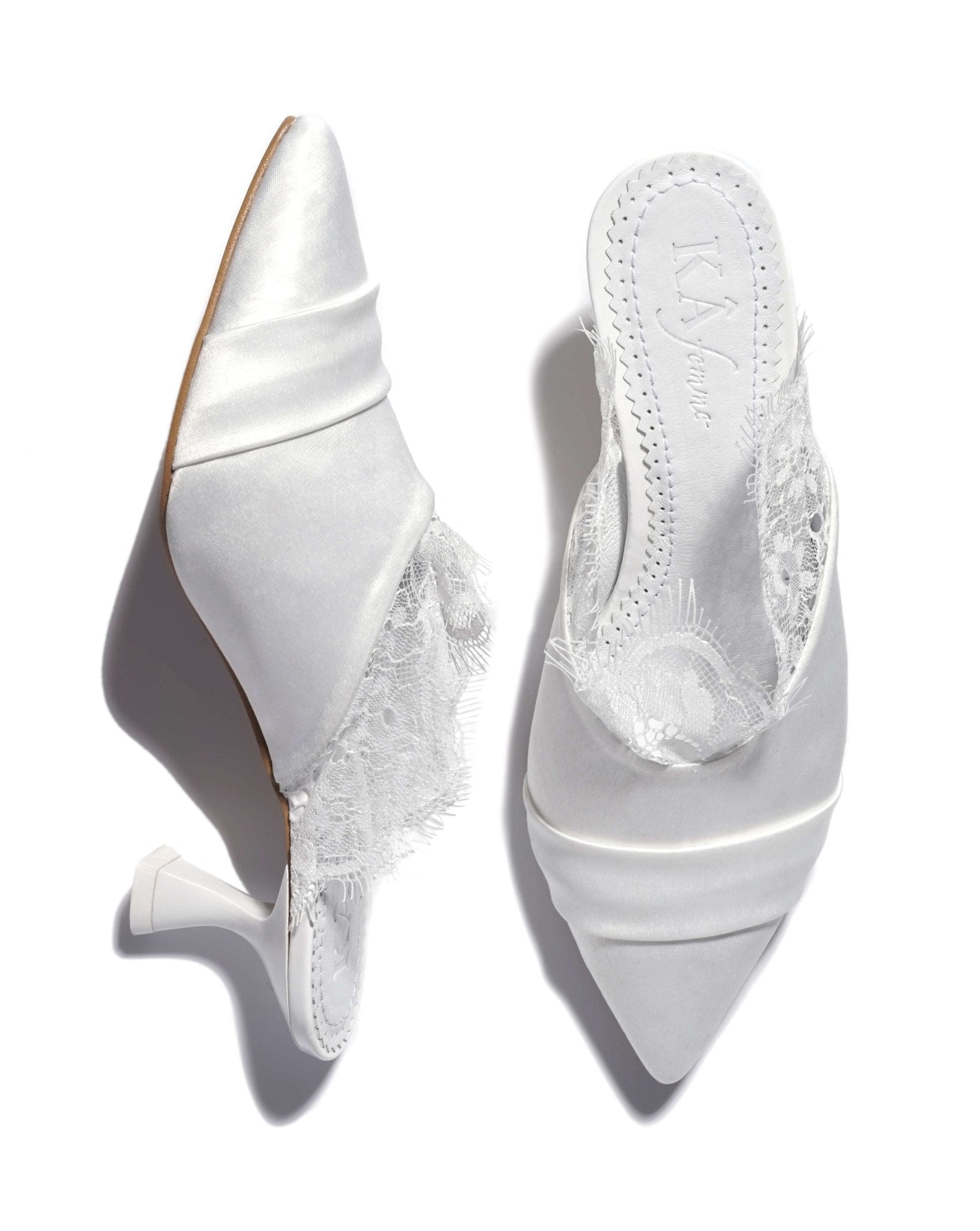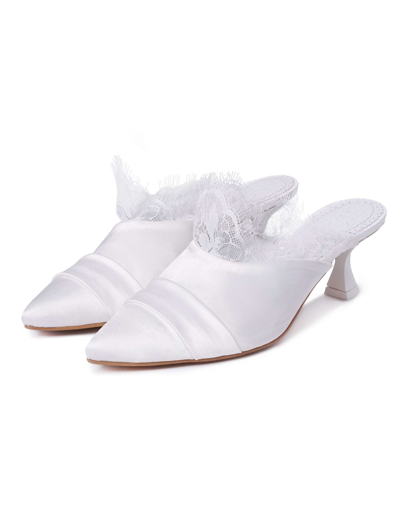 A slipper made for the moments that matter. Crafted from luminous satin and finished with delicate French lace, this pair evokes quiet sophistication. The pointed toe silhouette brings a refined edge, while the 4 cm/1.6'' heel offers just enough lift for graceful movement. The Delicate White Heeled Satin Slippers are shaped to follow the natural curve of your foot, ensuring the pointed toe remains comfortable and spacious throughout the day. Designed with a soft padded insole in genuine leather, these slippers feel as luxurious as they look.