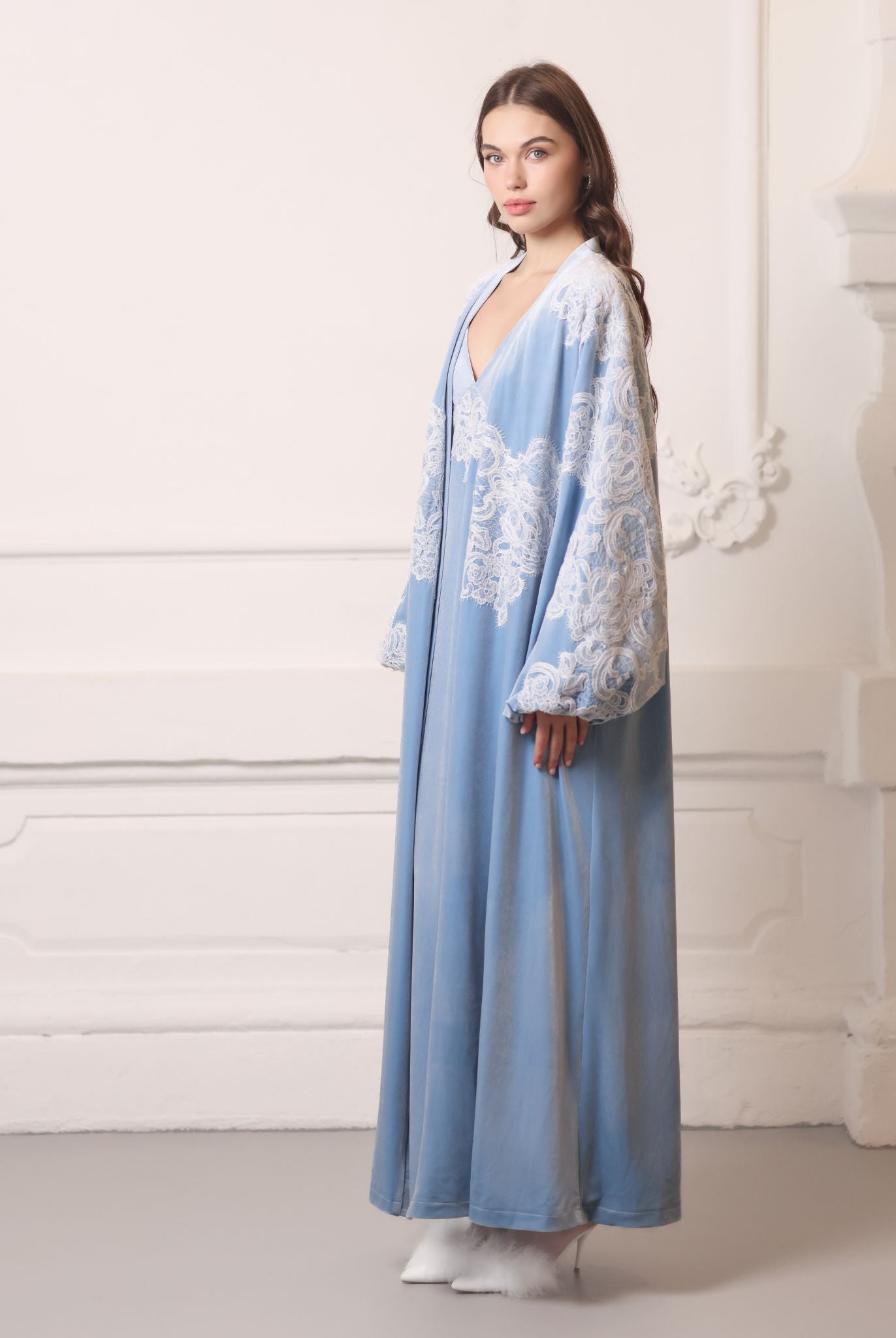 The Estelle Silk Set is crafted in 100 % luxurious mulberry silk. The princess style cut nightgown made in silk satin, glides effortlessly along the body, while the silk habotai sheer robe with lace embellished sleeves add a delicate, weightless layer. A graceful pairing for exciting bridal mornings and luminous nights after.