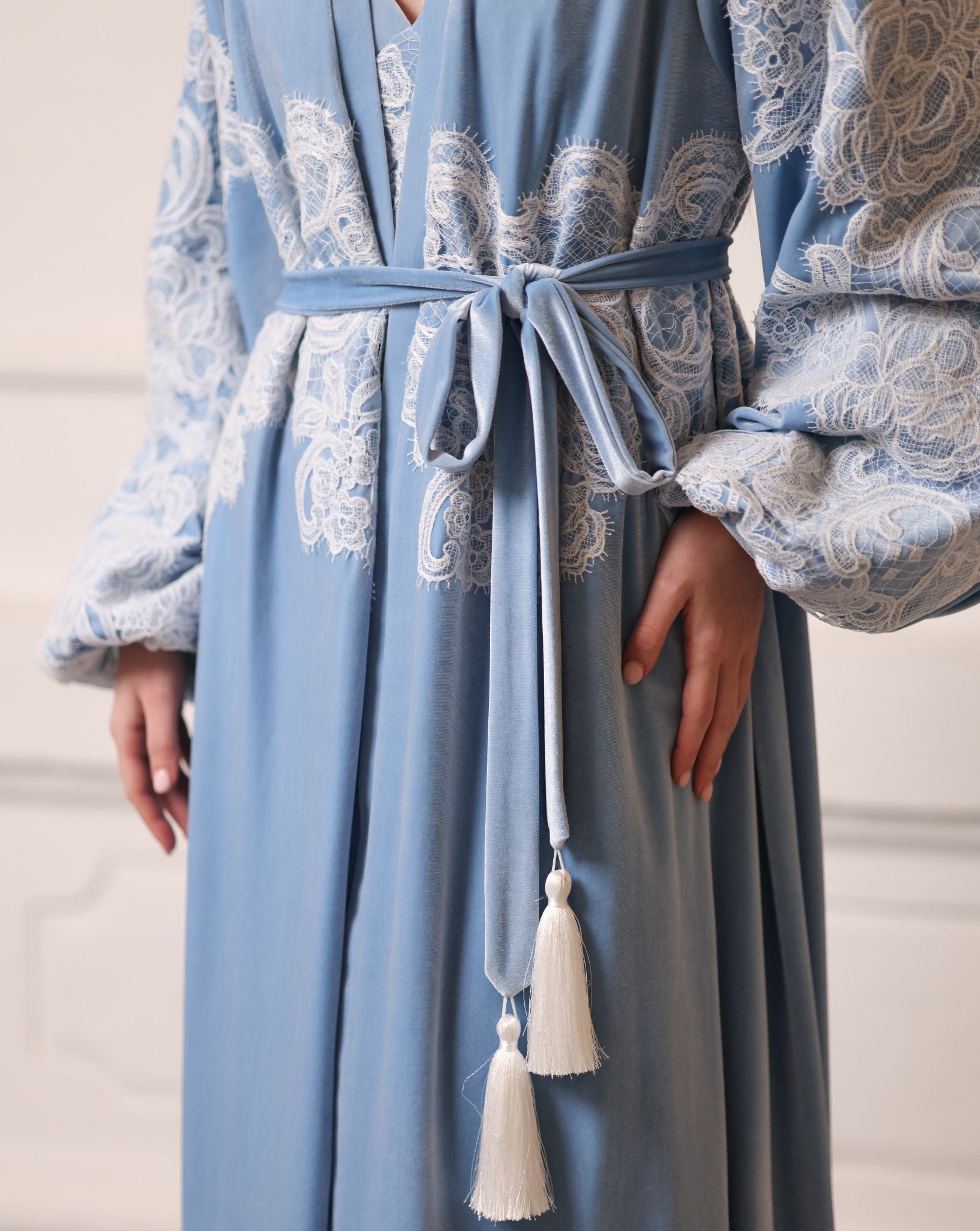 The North Muse Velvet Robe and Nightgown Set, designed for cold months of the year, will wrap you in the soft drama of its blue velvet. The long, flowing silhouette creates a regal presence, while the plush texture of velvet drapes with graceful weight and warmth. The nightgown features a flattering V-neck and bias-cut lines that follow the body with ease. Over it, the voluminous robe adds visual poetry, embellished with ivory corded lace that traces the sleeves and chest like delicate frost. Balloon sleeves taper gently at the wrist, adding shape without structure. Whether for elegant lounging, bridal preparation, or a moment of private indulgence, this set captures effortless grandeur in every fold. A luxurious essential for those who dream in textures, and live in slow, sensual moments.