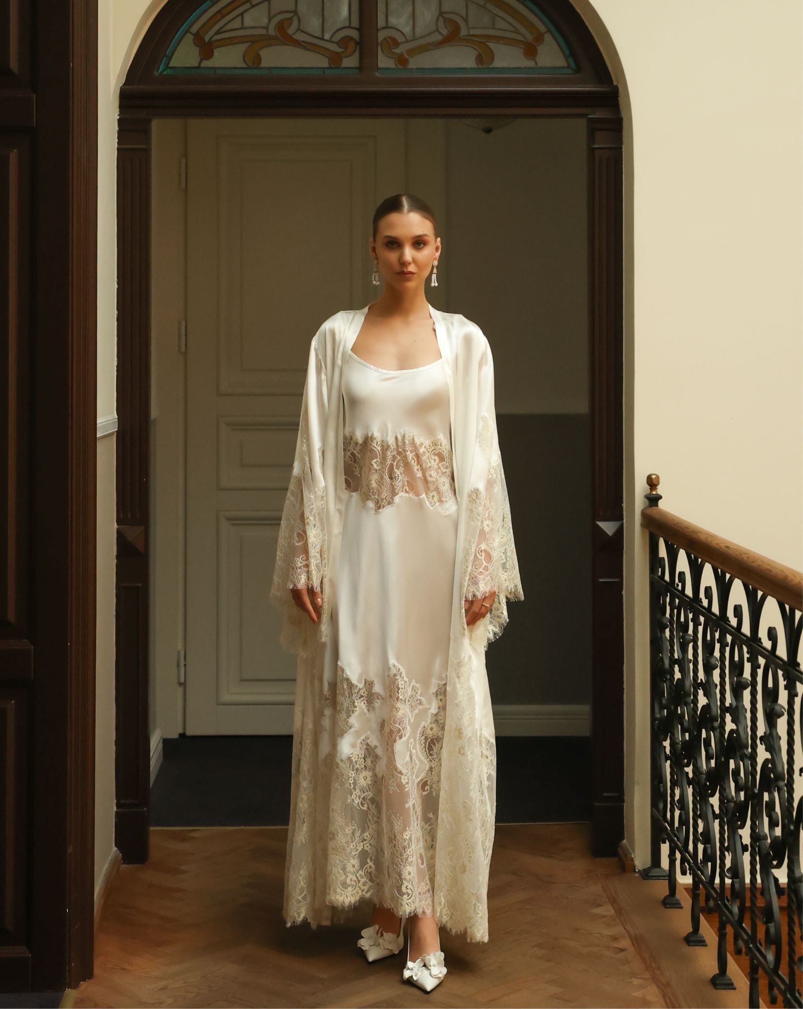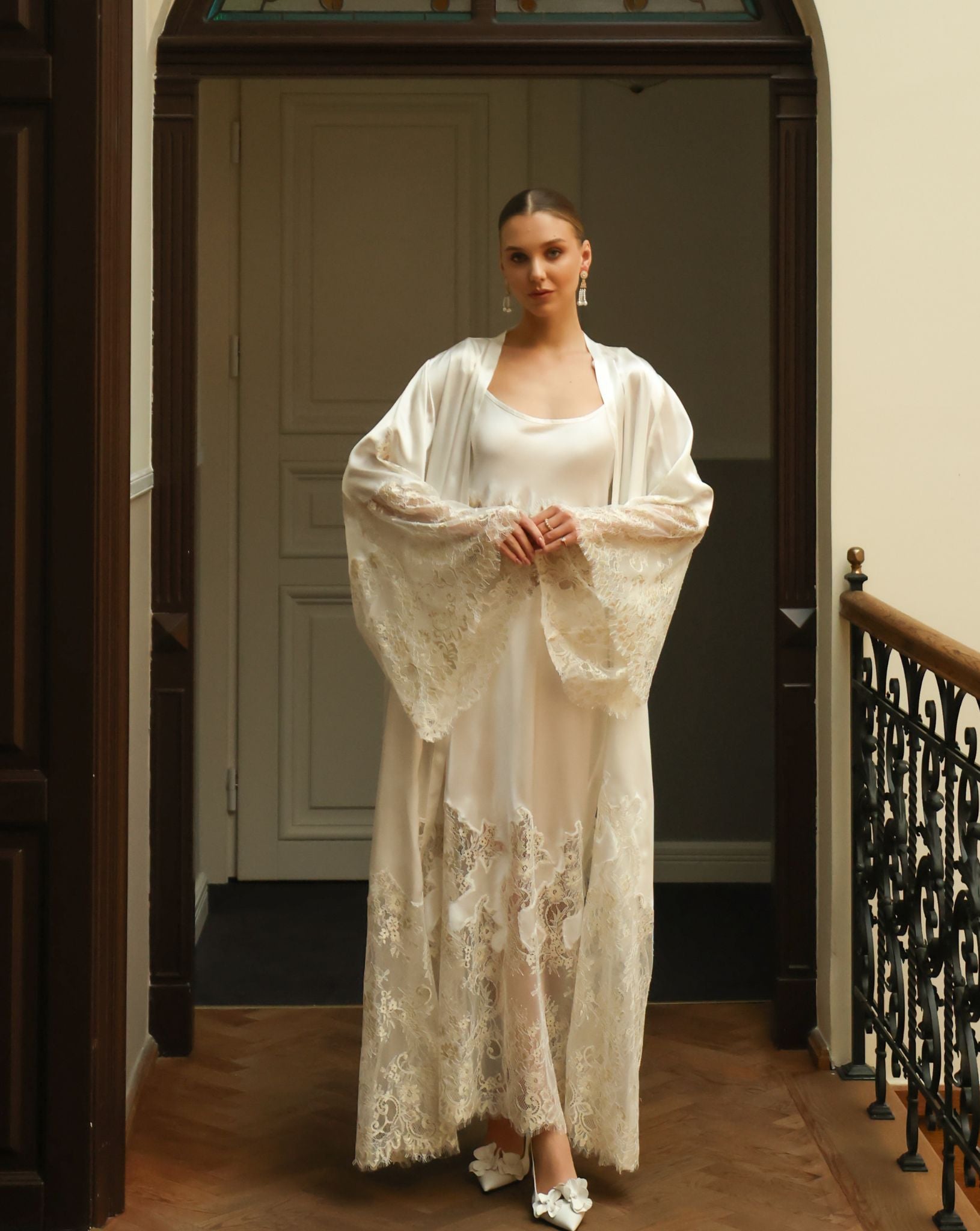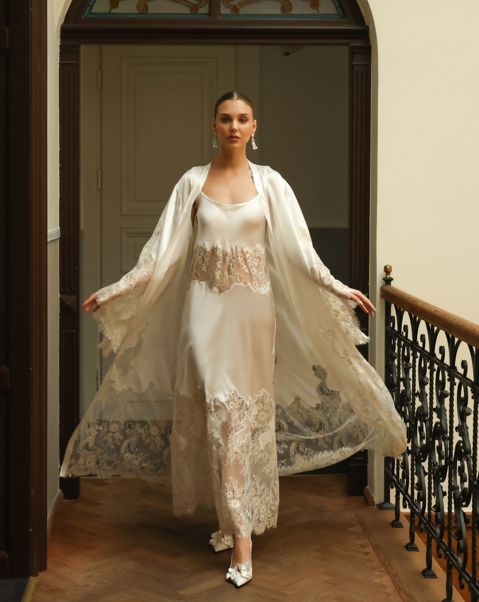 Indulge in your Grecian fantasy with the Santorini luxury robe and nightgown set, handcrafted by our master tailors. Made from ivory French Lace and 100% natural white silk, this heavenly set is sensual and soft on the skin.