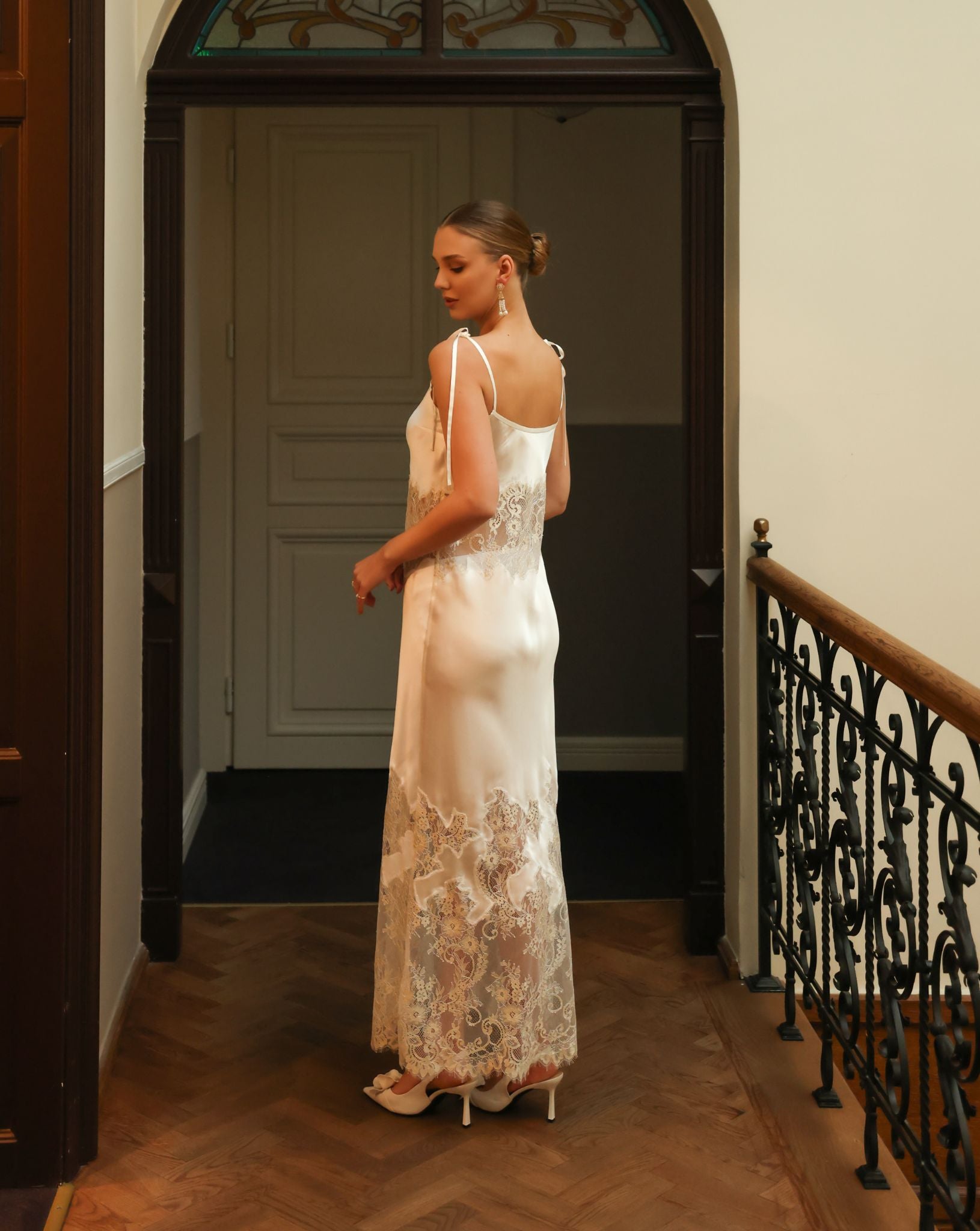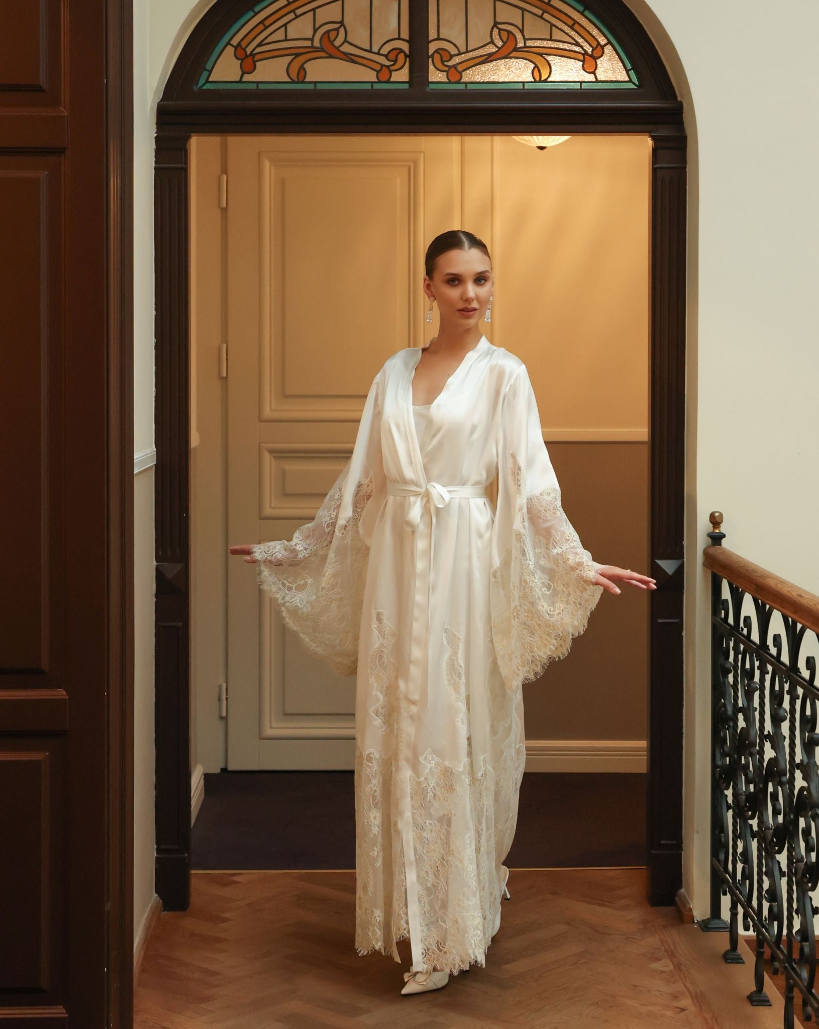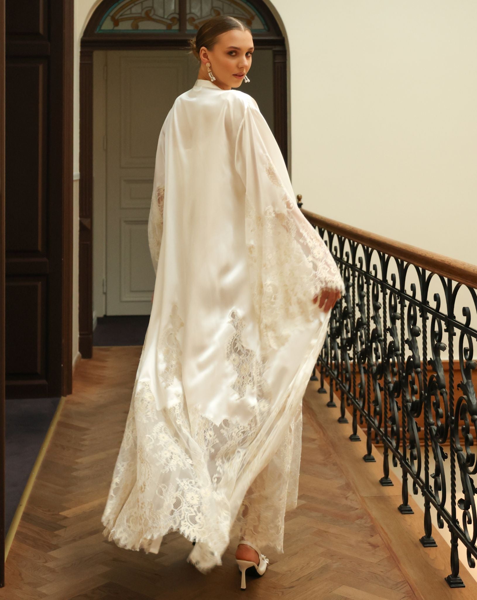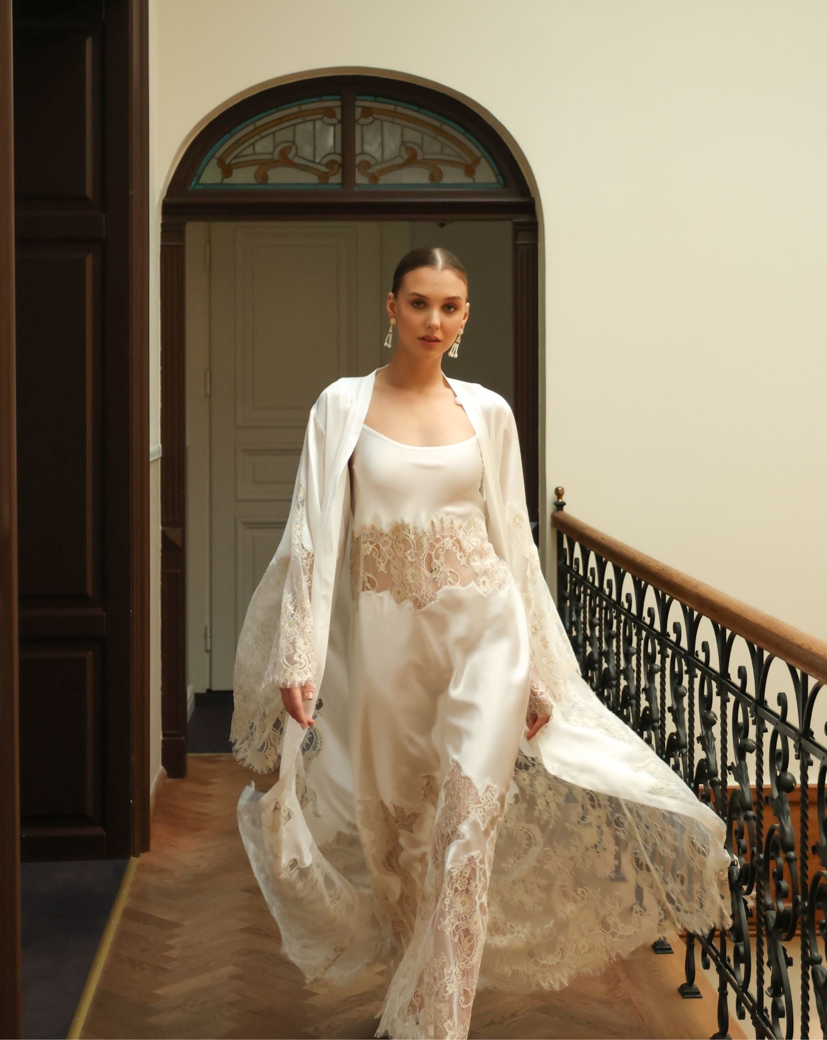 Indulge in your Grecian fantasy with the Santorini luxury robe and nightgown set, handcrafted by our master tailors. Made from ivory French Lace and 100% natural white silk, this heavenly set is sensual and soft on the skin.
