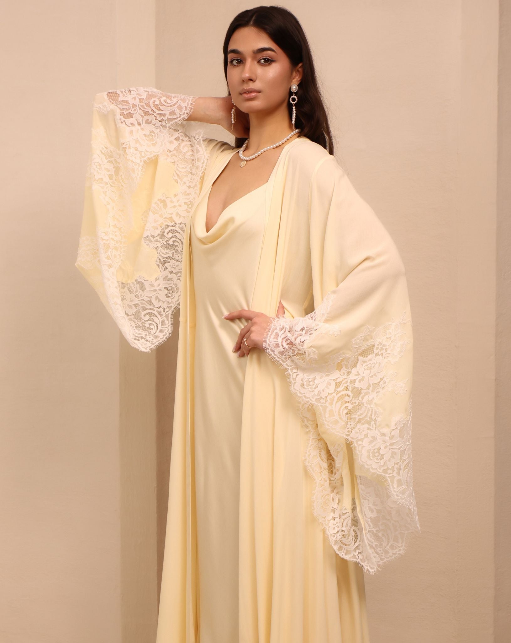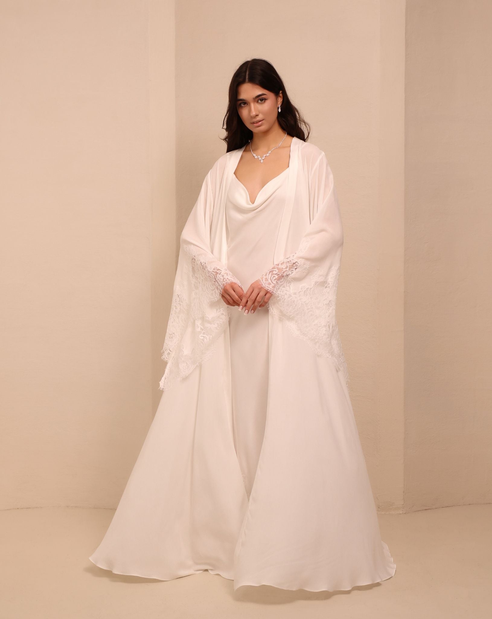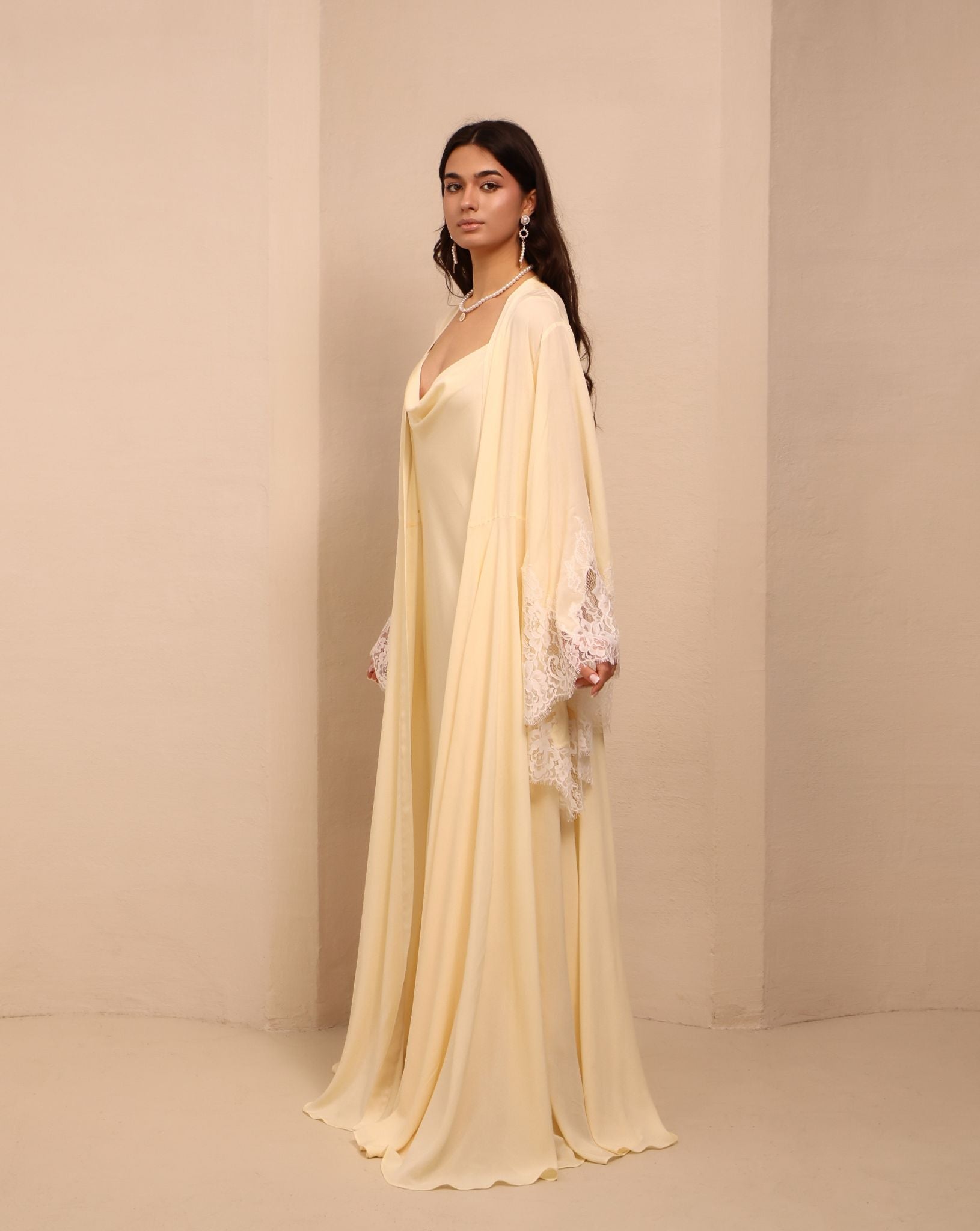 The robe drapes effortlessly over the body, while the nightgown caresses the skin with its delicate fabric and graceful neckline. Together, they create a silhouette that feels like a starlit rendezvous — intimate, ethereal, and unforgettable. Perfect for slow evenings, bridal gifting, or simply elevating your nightly routine.