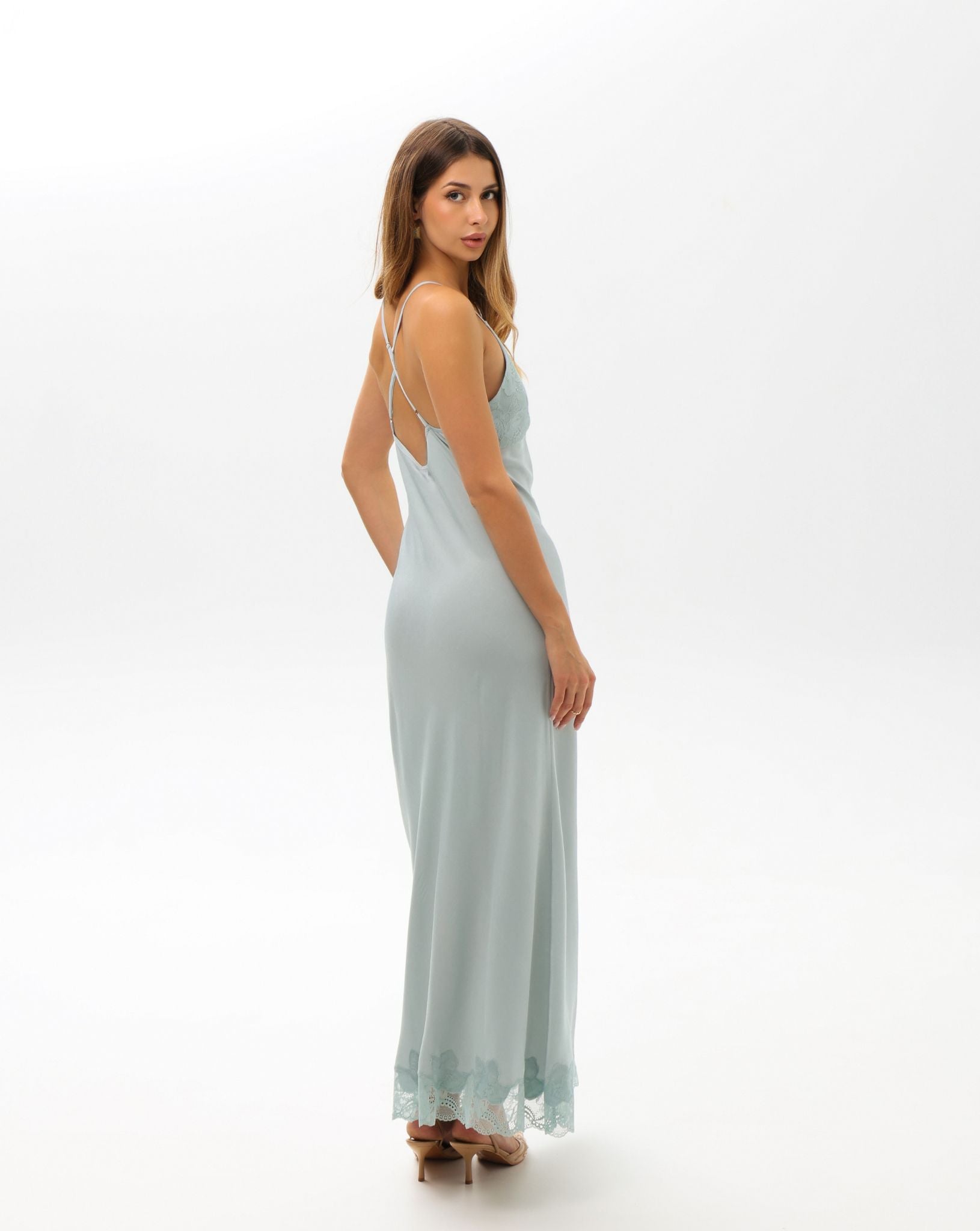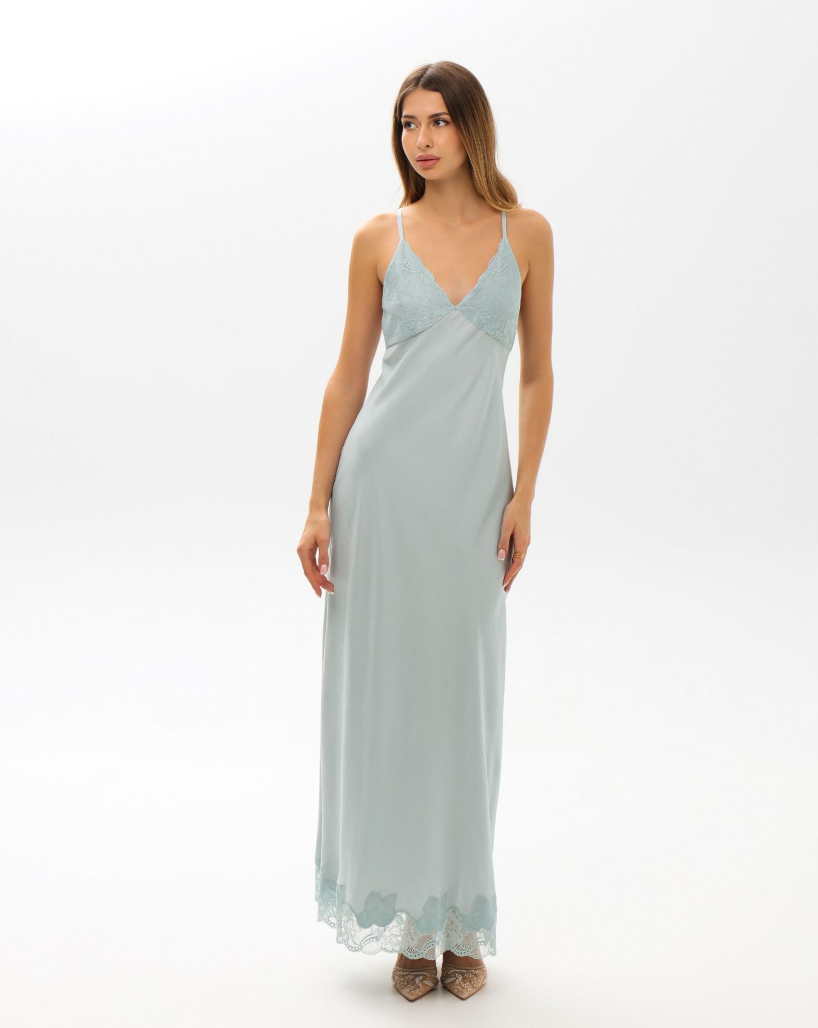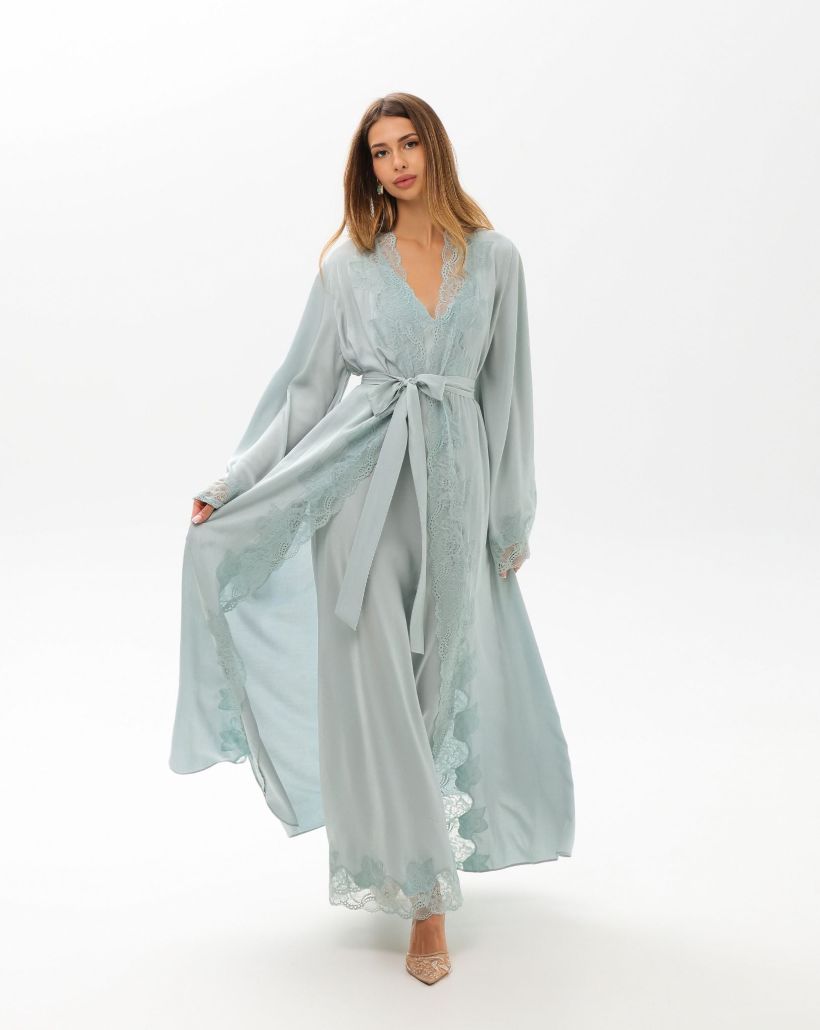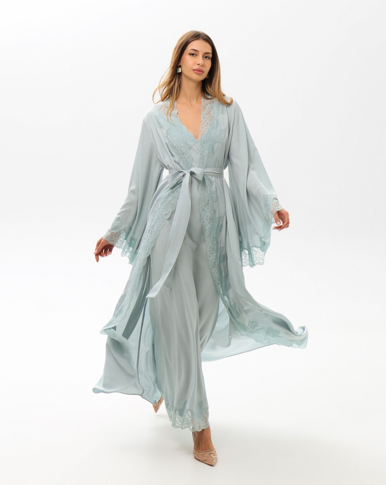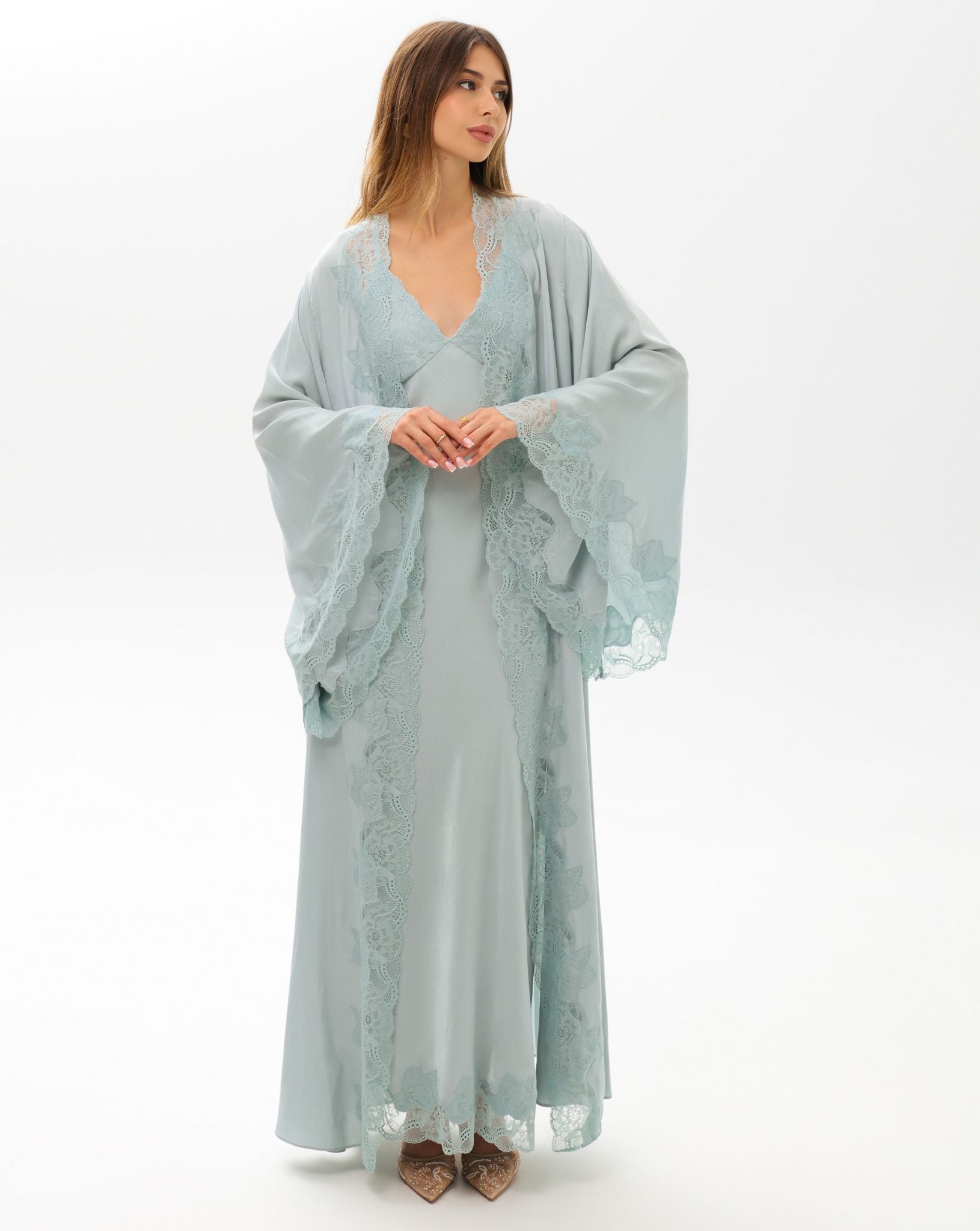 This viscose set captures the essence of soft femininity and graceful ease. Made from 100% viscose, it offers a breathable, fluid drape that gently follows the body’s natural movement. The robe features a flowing silhouette with delicate lace detailing at the sleeves and edges, adding a romantic touch that frames the look beautifully. Underneath, the nightdress mirrors the same softness, with a flattering cut and subtle lace accents that elevate its simplicity. Lightweight yet refined, this robe and nightgown set is thoughtfully designed for quiet moments of beauty at home — whether you’re starting your morning in stillness or winding down after a long day. Every detail, from the natural sheen of the fabric to the elegant finish, speaks of understated luxury and comfort. A timeless companion for soft, personal rituals.