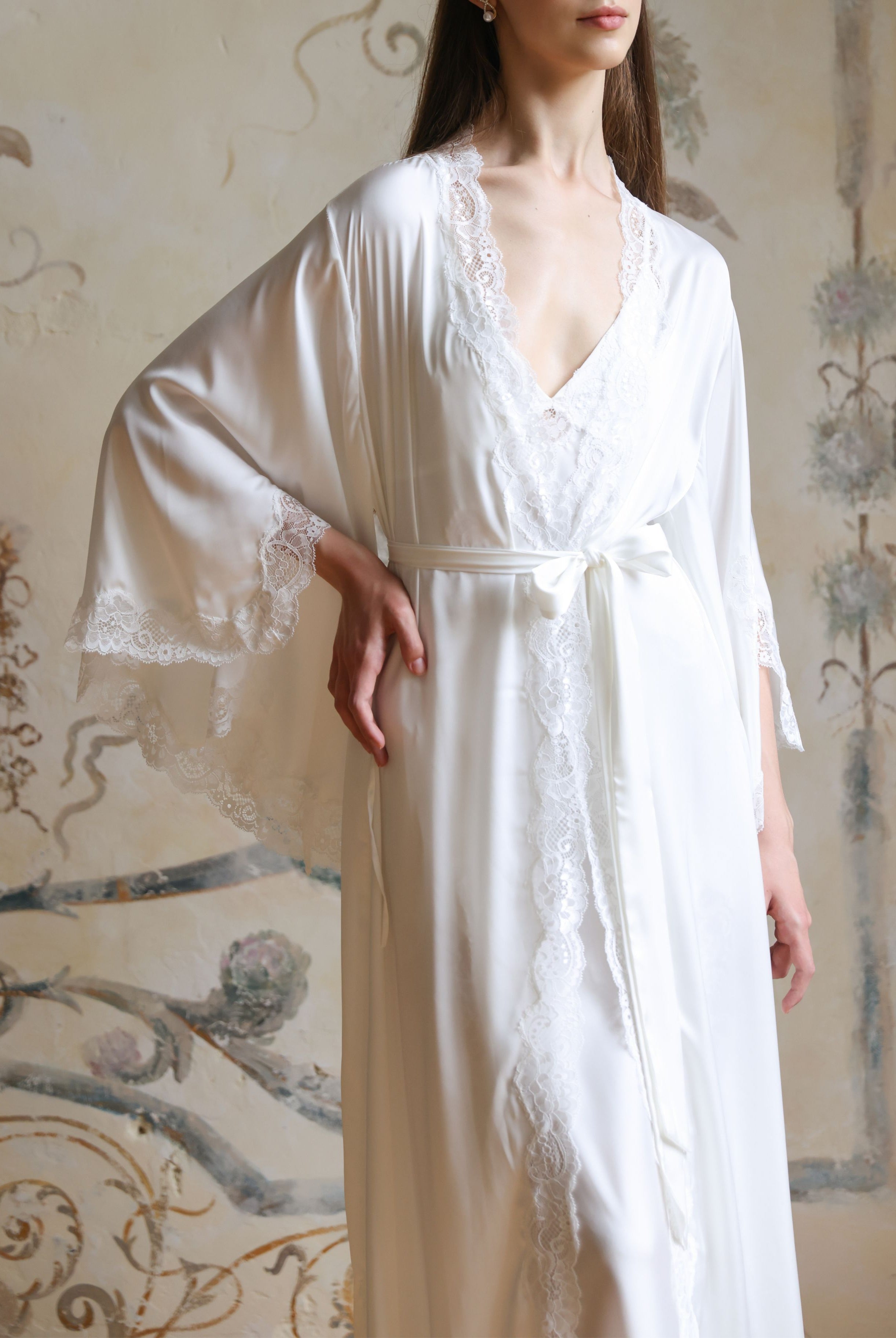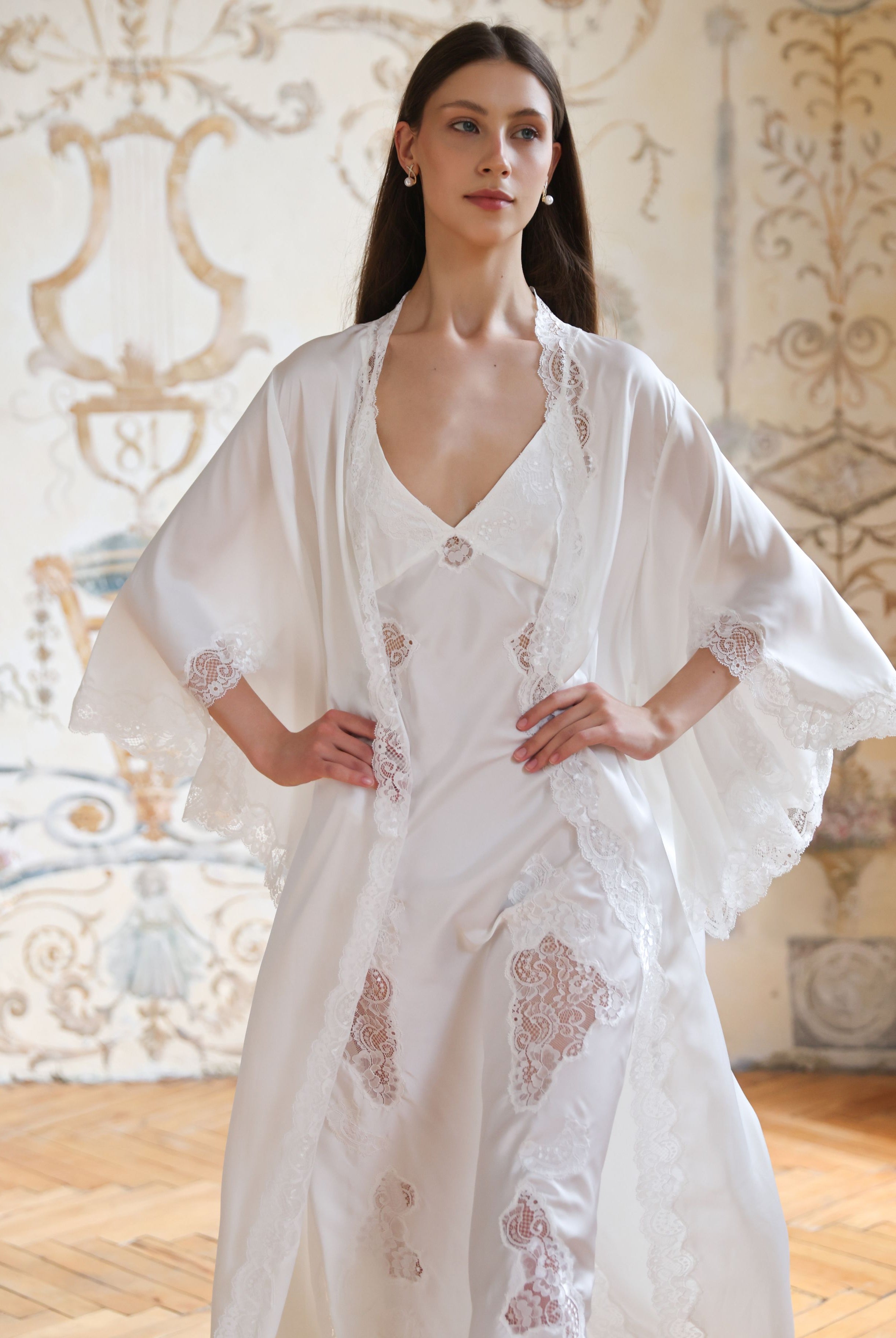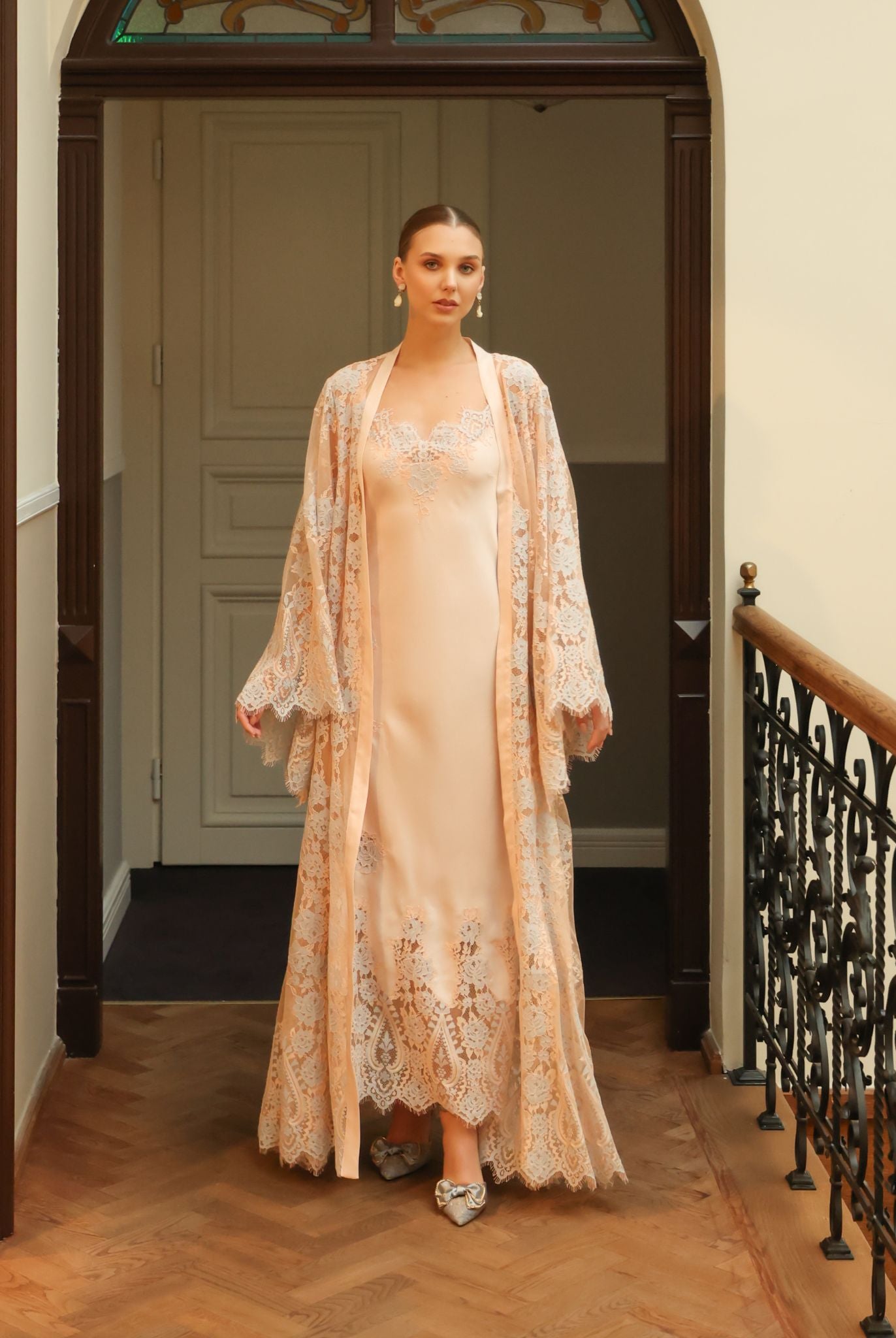 The Annabelle Lace Robe is the epitome of bridal elegance. Crafted from luxurious lace, this robe features intricate detailing that adds a touch of sophistication to your special day. Perfect for brides or just an elegant home look, it drapes beautifully, creating a timeless and romantic silhouette.