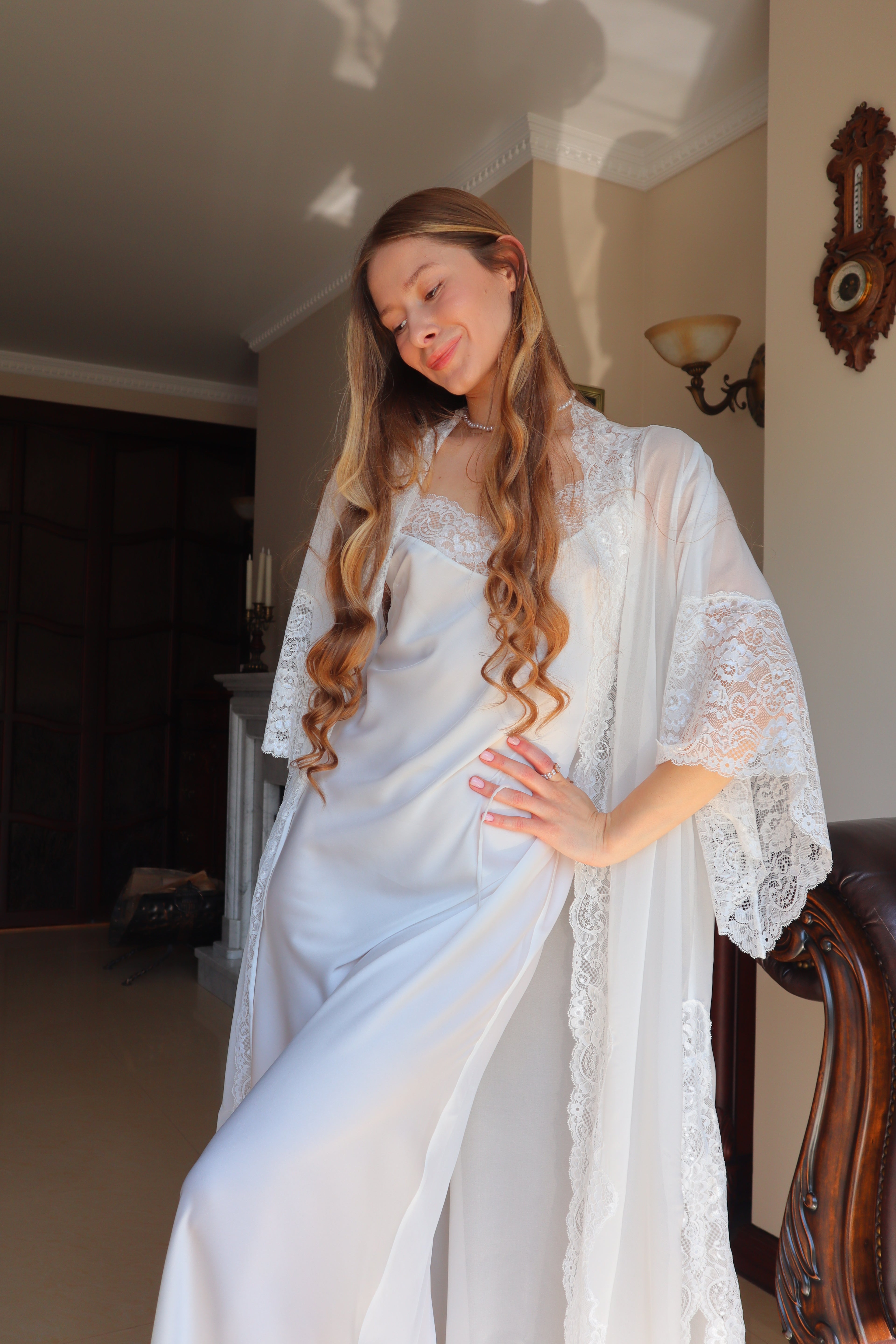 The Magnolia Set includes a long nightgown in a breathable cotton–blend with adjustable straps. It features lace along the neckline and scattered peach and blue lace appliqués through the body and hem. The coordinating lace robe drapes to the floor and is finished with lace at the wide sleeves. A soft, timeless silhouette that will never get out of style.