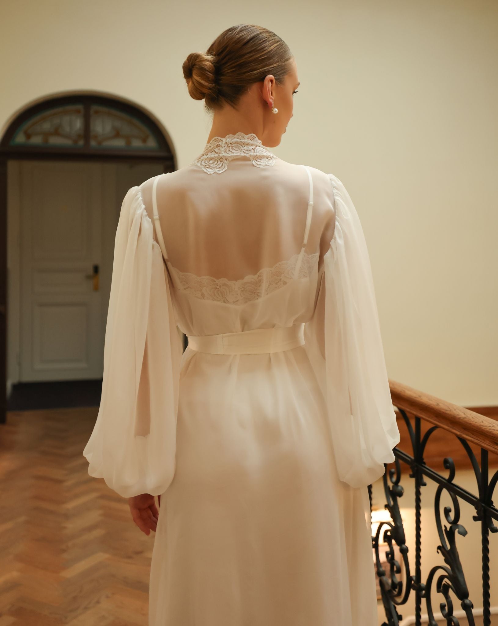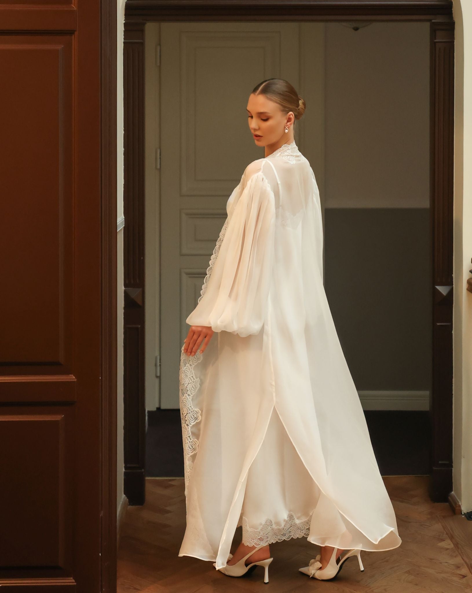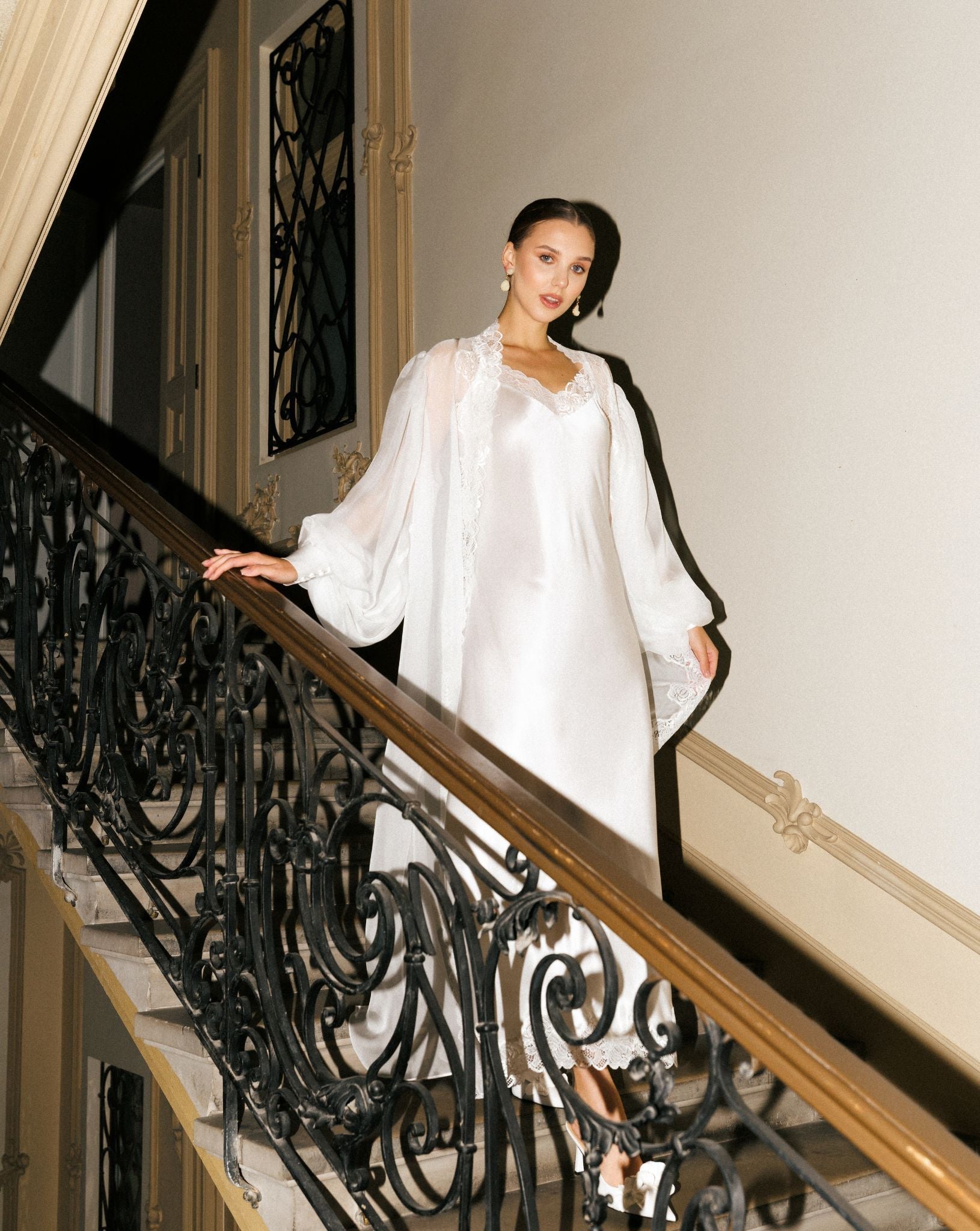 The Geneva Silk Set is crafted in 100 % luxurious mulberry silk. The nightgown made in silk satin, glides effortlessly along the body, while the silk chiffon sheer robe with puffy sleeves, silk cuffs and buttons adds a delicate, weightless layer. A graceful pairing for exciting bridal mornings and luminous nights after.