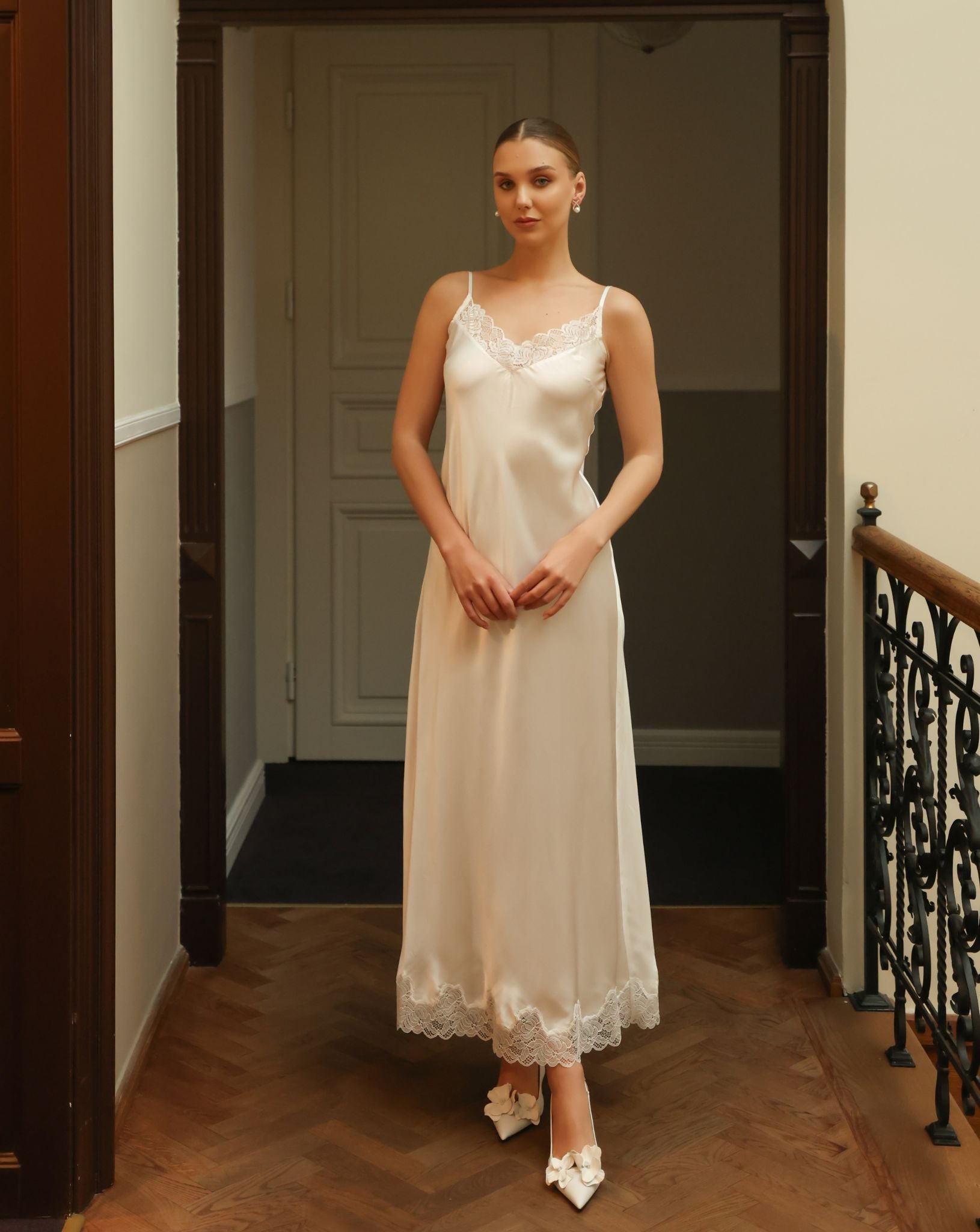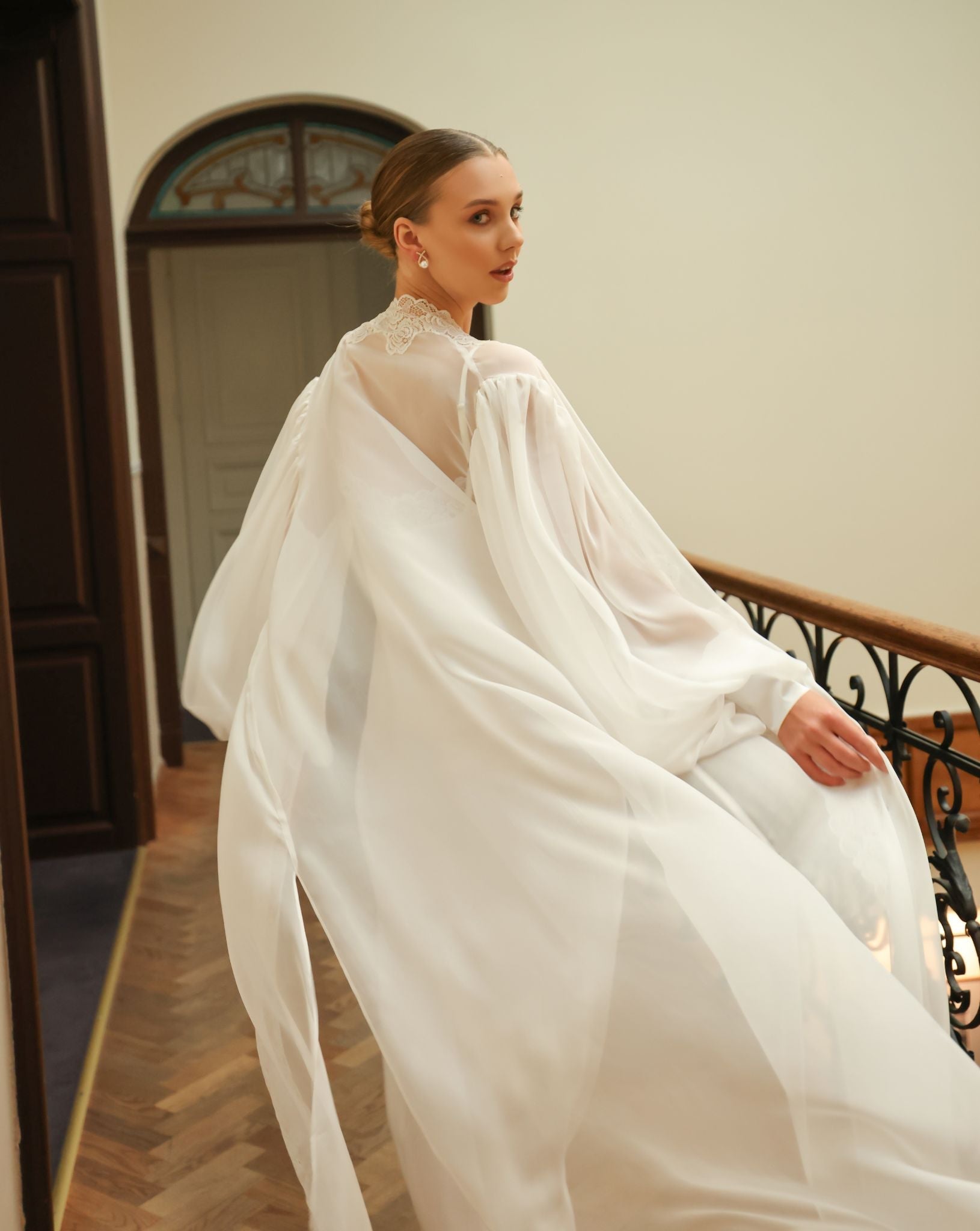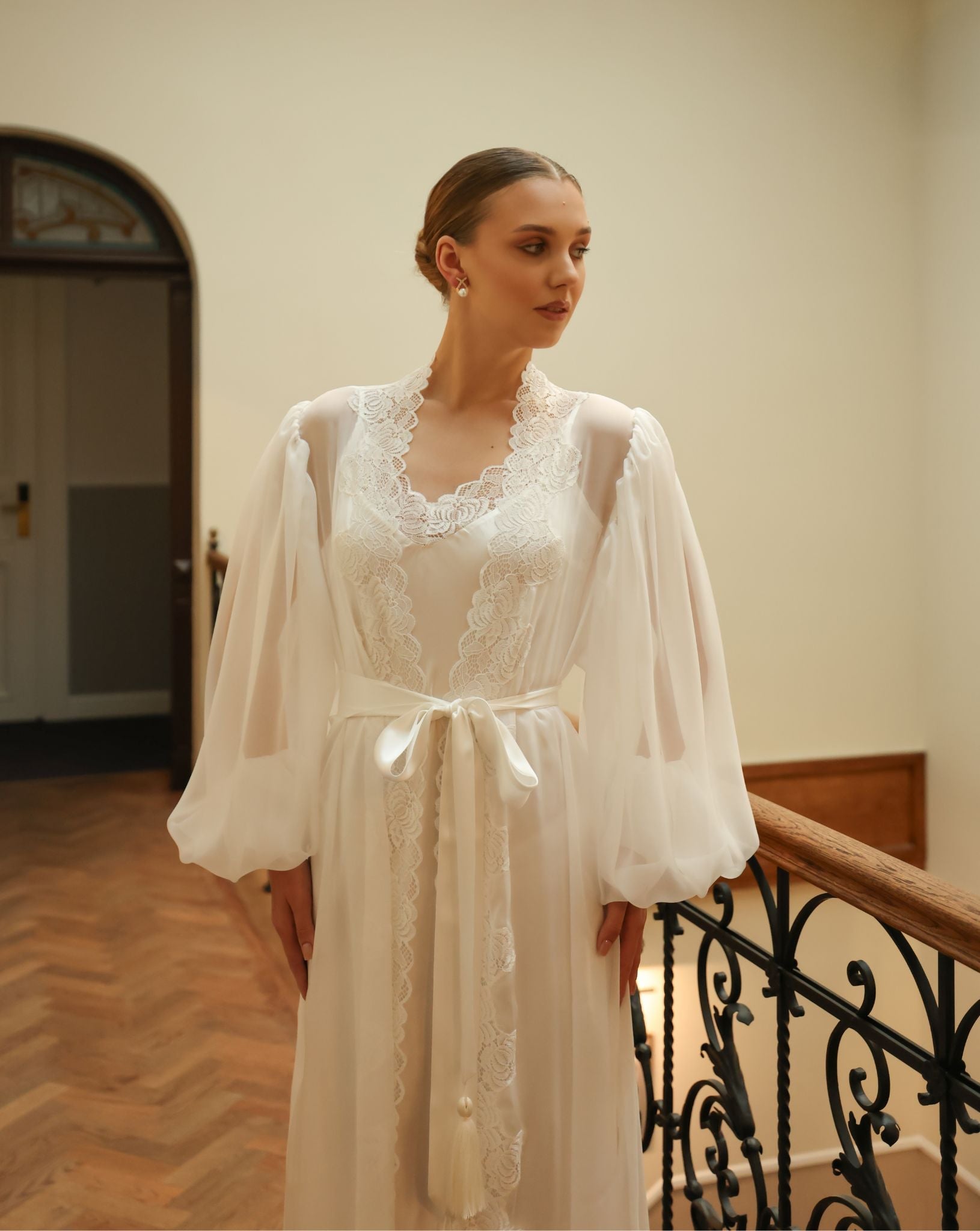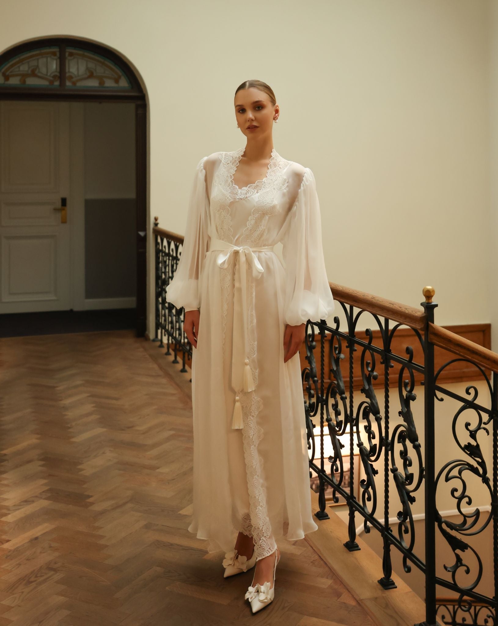 The Geneva Silk Set is crafted in 100 % luxurious mulberry silk. The nightgown made in silk satin, glides effortlessly along the body, while the silk chiffon sheer robe with puffy sleeves, silk cuffs and buttons adds a delicate, weightless layer. A graceful pairing for exciting bridal mornings and luminous nights after.