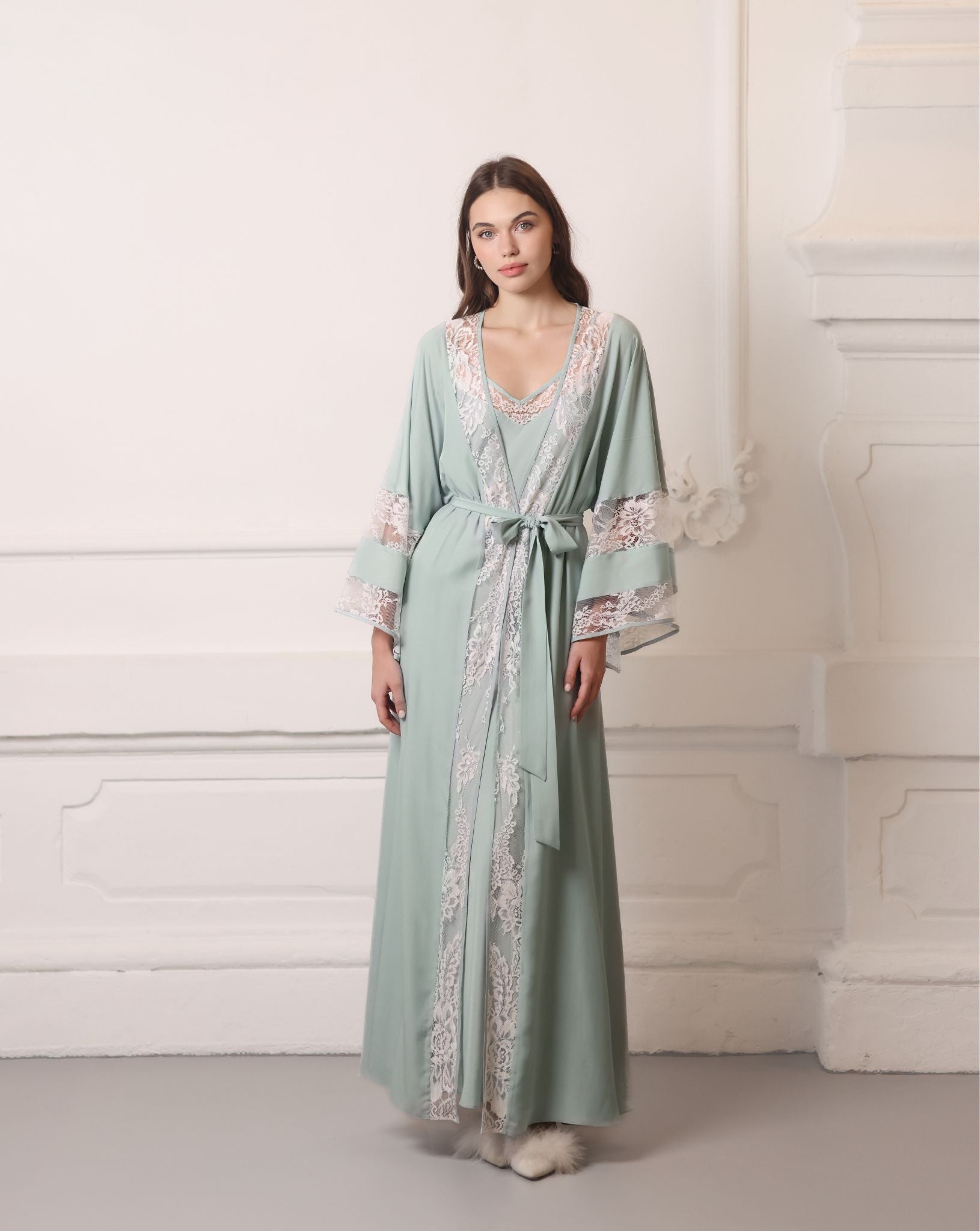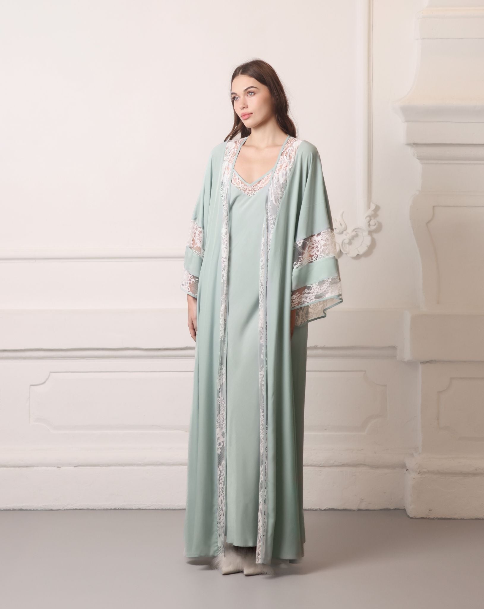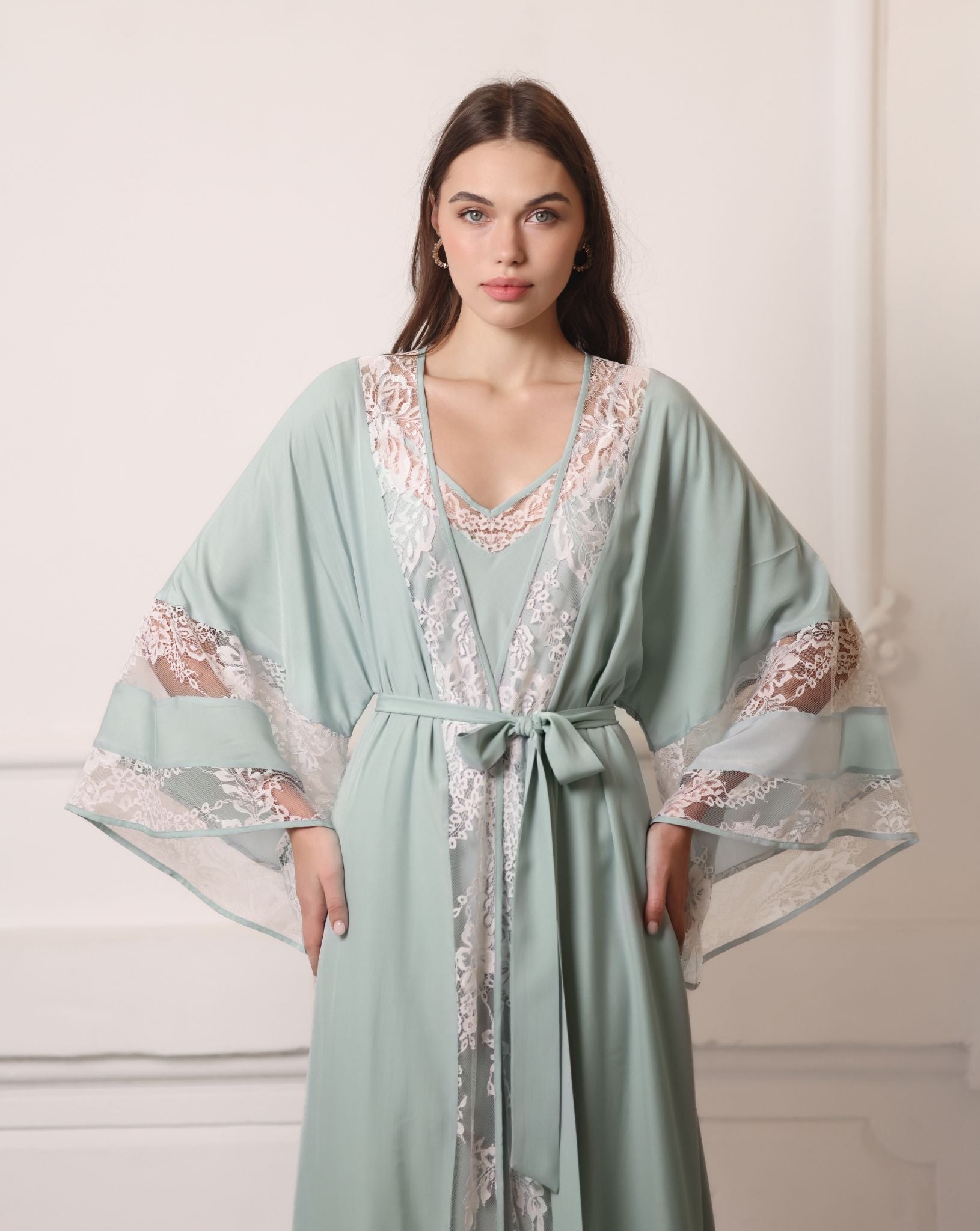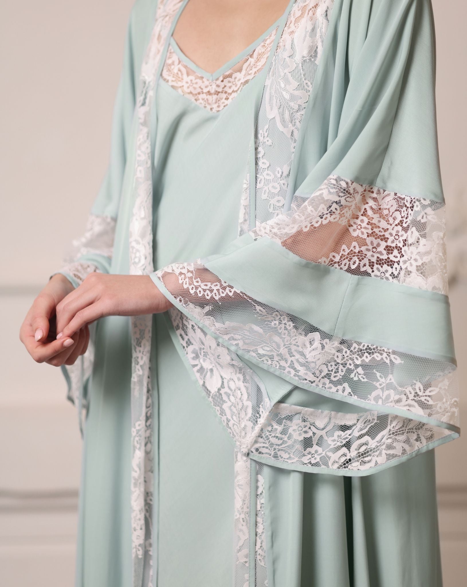 A dream to wear, this robe and nightgown set captures effortless grace and comfort. Made from soft, breathable viscose, it gently drapes over the body, creating a lightweight, airy feel that’s perfect for warm days or peaceful nights. The long robe features sheer lace panels along the sleeves and cuffs, adding a whisper of romance to every movement. The matching nightgown flows smoothly underneath, with delicate lace details at the neckline for a subtle yet refined finish. Designed for ease and elegance, the set offers a flattering silhouette while keeping comfort at its core. Whether you’re unwinding at home or preparing for a quiet morning, this piece invites you to move slowly, breathe deeply, and enjoy the beauty of softness. An elegant companion for calm, everyday luxury.
