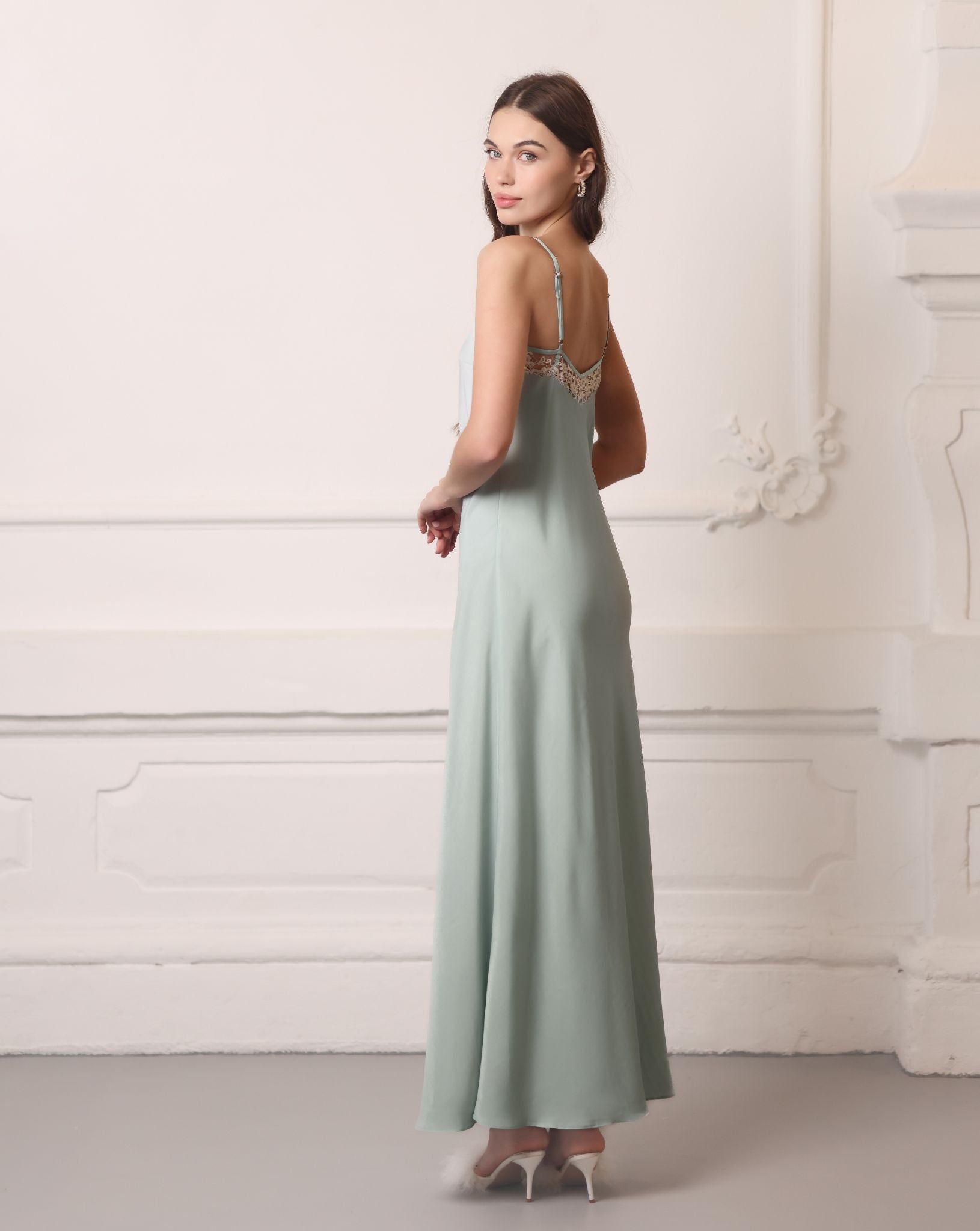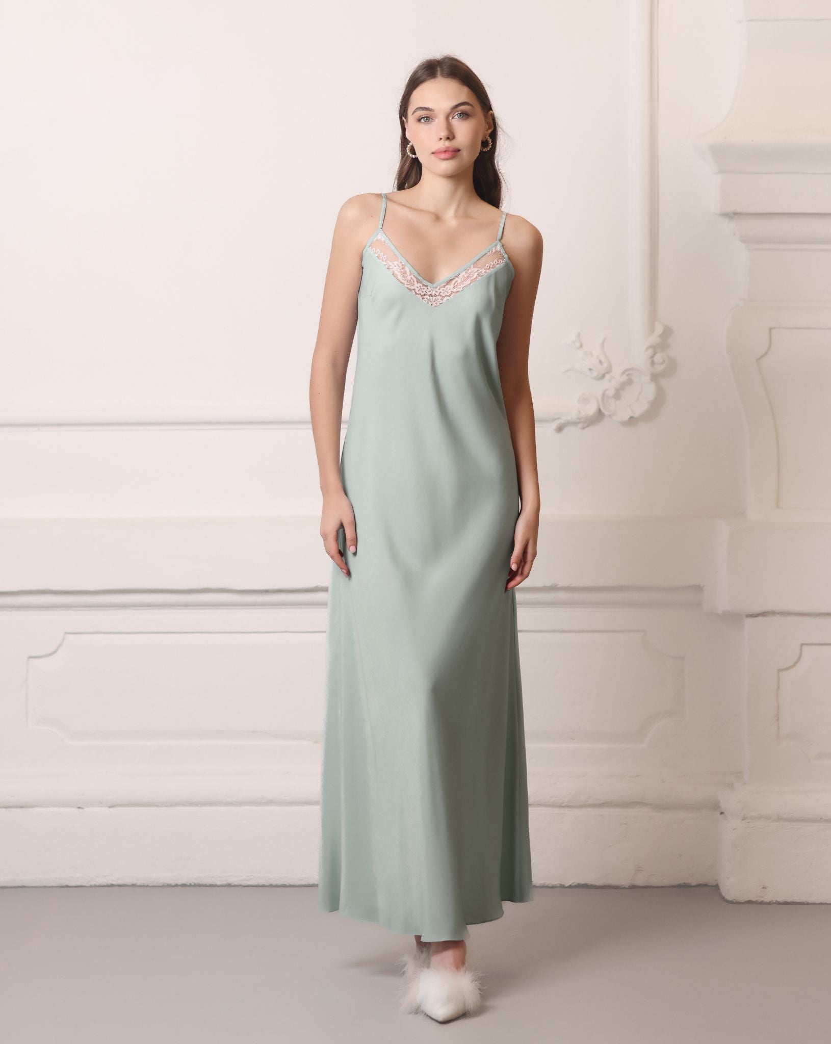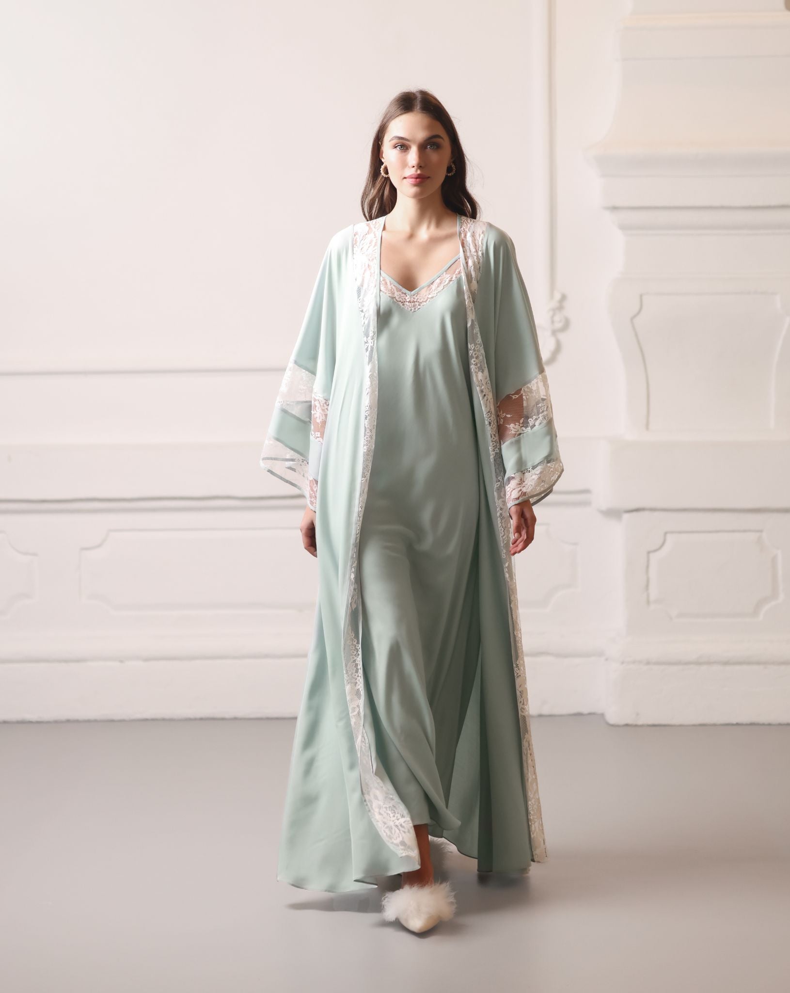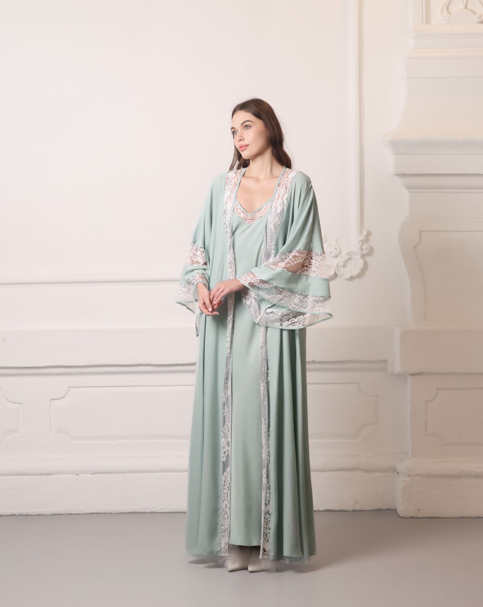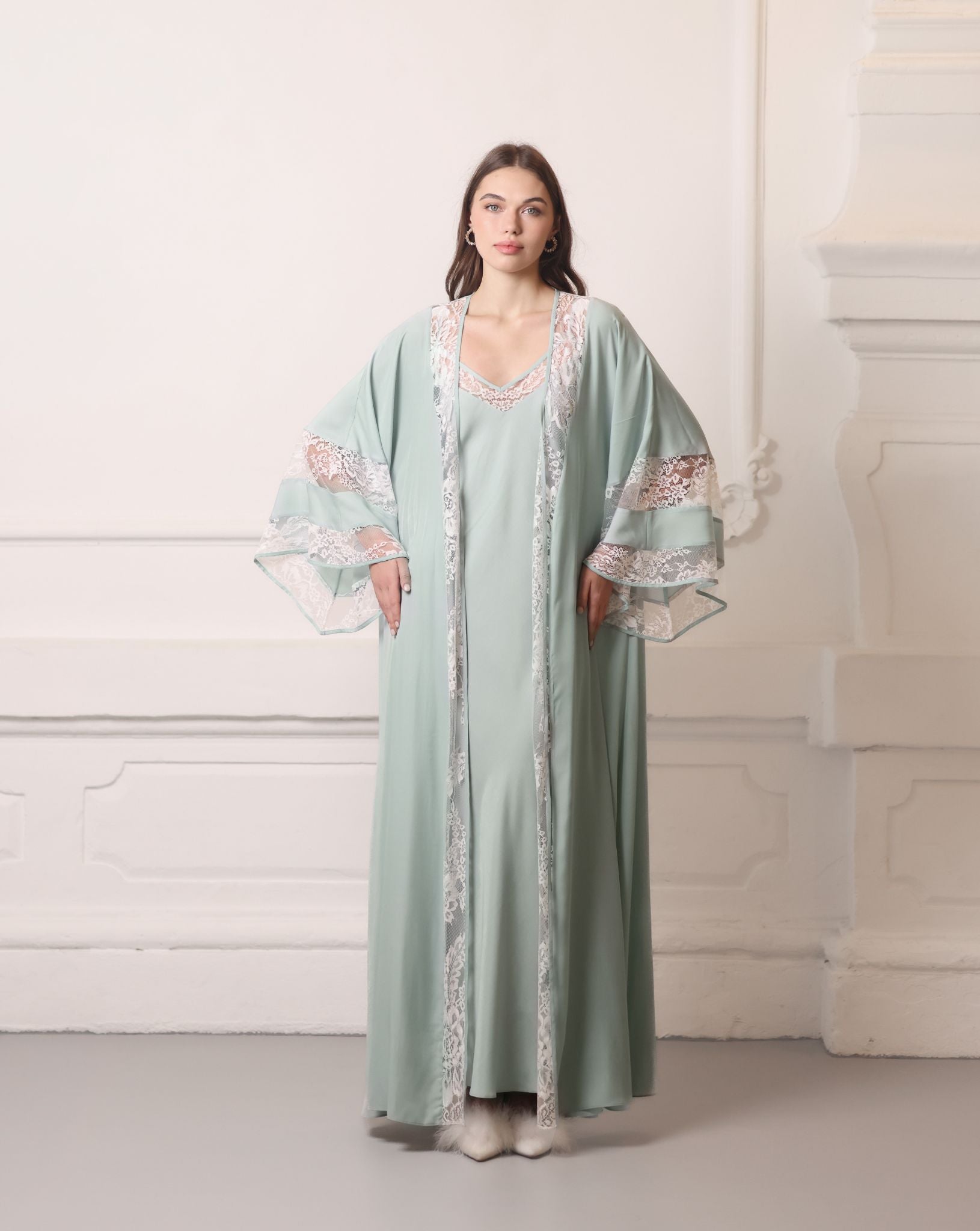 A dream to wear, this robe and nightgown set captures effortless grace and comfort. Made from soft, breathable viscose, it gently drapes over the body, creating a lightweight, airy feel that’s perfect for warm days or peaceful nights. The long robe features sheer lace panels along the sleeves and cuffs, adding a whisper of romance to every movement. The matching nightgown flows smoothly underneath, with delicate lace details at the neckline for a subtle yet refined finish. Designed for ease and elegance, the set offers a flattering silhouette while keeping comfort at its core. Whether you’re unwinding at home or preparing for a quiet morning, this piece invites you to move slowly, breathe deeply, and enjoy the beauty of softness. An elegant companion for calm, everyday luxury.